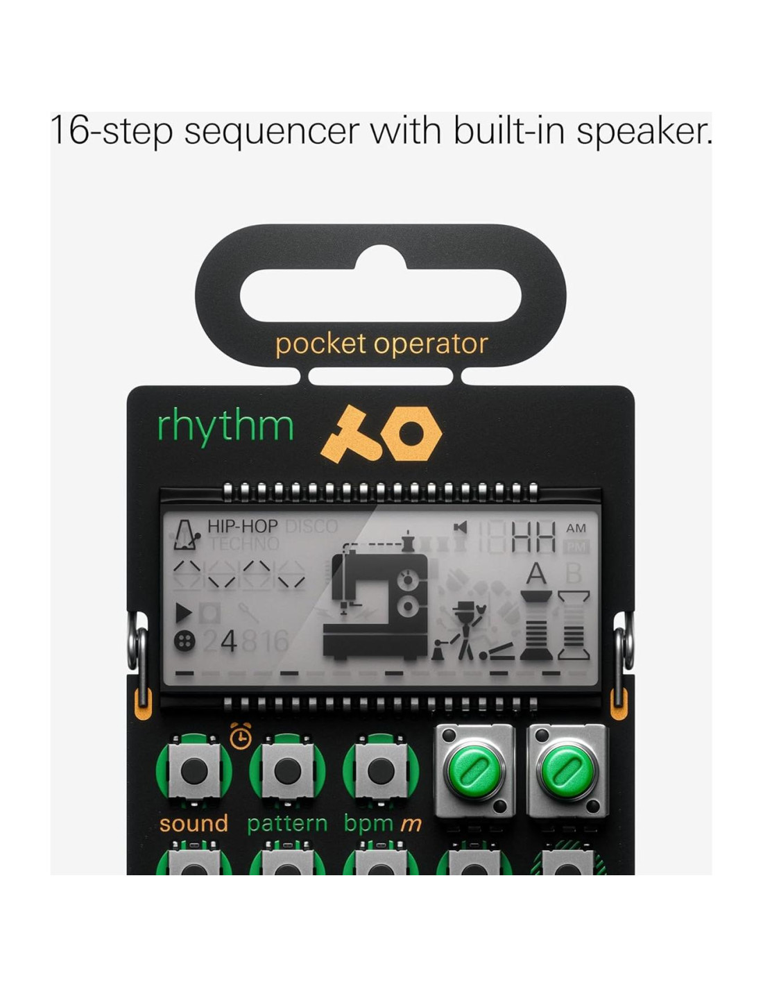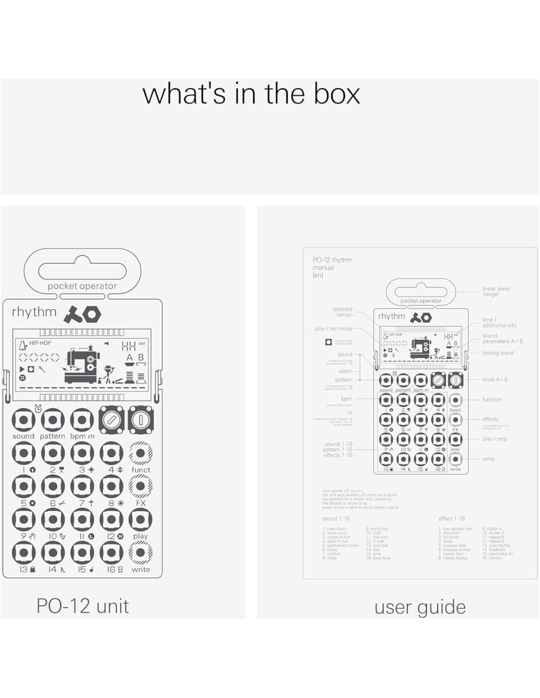- secuencia y añade efectos - secuencia tus ritmos. el PO-12 de tamaño nano también incluye 16 efectos de inserción para mejorar y modificar tus sonidos, sé creativo y ajusta tus composiciones en cualquier dirección. usa 16 cadenas de patrones para unirlos y construir tu pista.