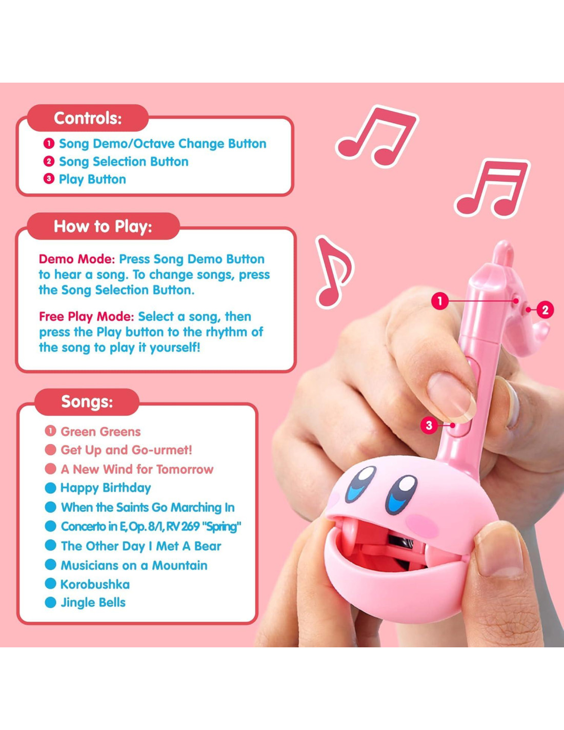 - componentes incluidos: 1 Otamatone Kirby (tamaño regular con instrucciones en inglés), 1 Otamatone Kirby (tamaño melodía con empaque en inglés)
