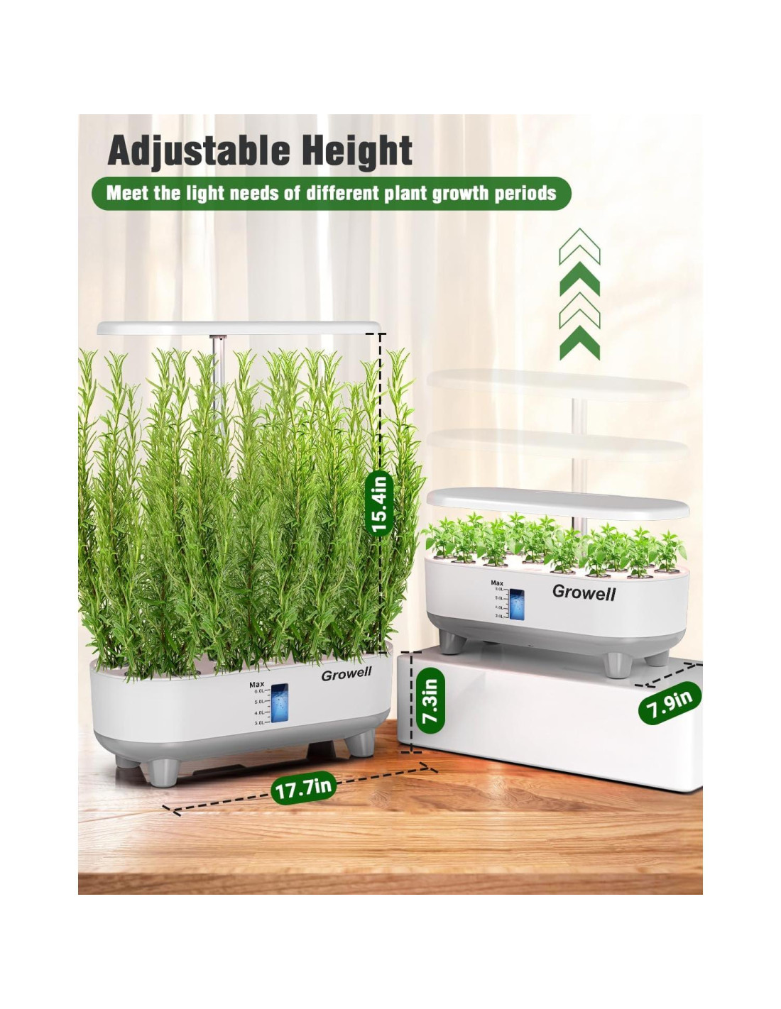 - 16 Cápsulas y Altura Ajustable: Este jardín de hierbas interior mejorado tiene 16 cápsulas de plantación, permitiéndote cultivar 16 plantas a la vez, mejorando la eficiencia y conservando tiempo valioso. La altura de luz de crecimiento ajustable de 15.4 pulgadas (39.1 cm) permite que las plantas en diferentes etapas de crecimiento obtengan condiciones de luz y espacio de crecimiento más adecuados, permitiendo que las plantas crezcan más rápido y más fuertes. El innovador diseño del poste de luz desmontable simplifica el mantenimiento, brindándote fácil acceso para limpiar el tanque.