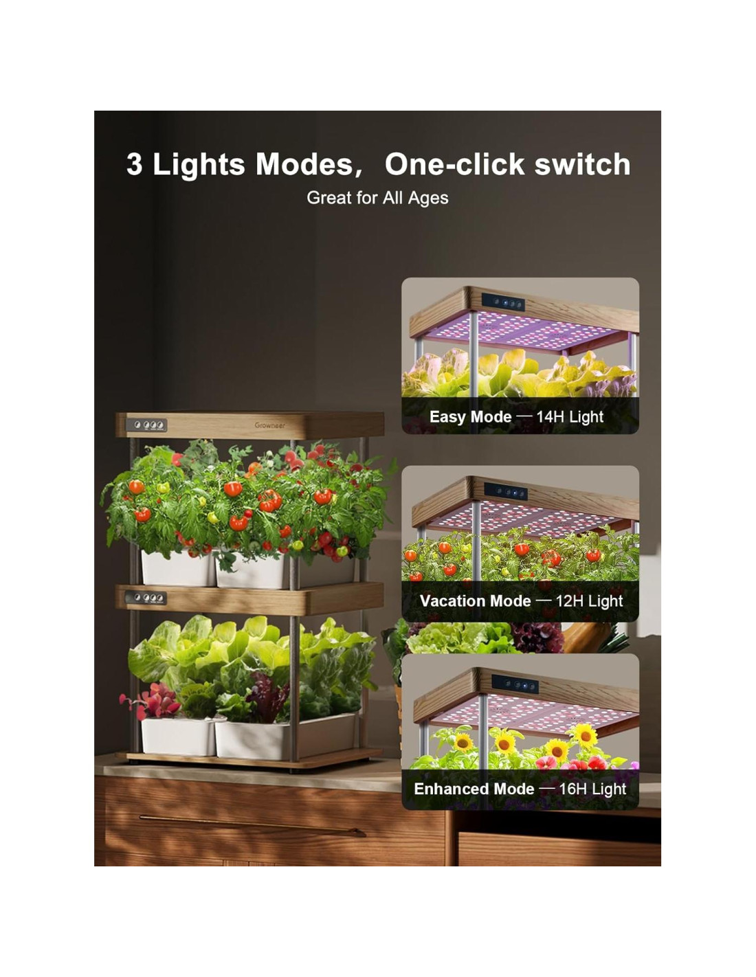 - ALTA VELOCIDAD Y ALTO RENDIMIENTO - Proporciona tres opciones de duración de luz: 12h, 14h y 16h. La opción extendida de 16h es ideal para impulsar el crecimiento, aumentando el rendimiento promedio hasta un 50%. Esto permite una cosecha fresca durante todo el año sin largos tiempos de espera, como lechuga, tomates, pimientos, hierbas, bayas y flores