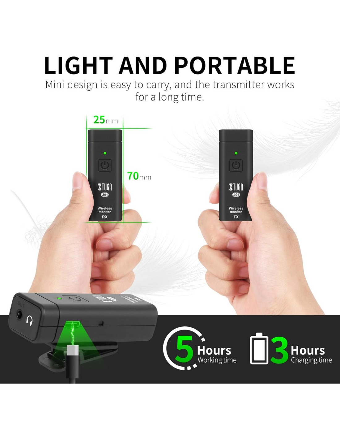 - Larga Duración de Batería: Con baterías de litio recargables, tanto el transmisor como el receptor in-ear inalámbricos ofrecen un uso prolongado, proporcionando hasta 5 horas de tiempo de reproducción con una carga completa. Esto asegura un disfrute ininterrumpido de tus esfuerzos musicales sin la preocupación de quedarte sin energía.