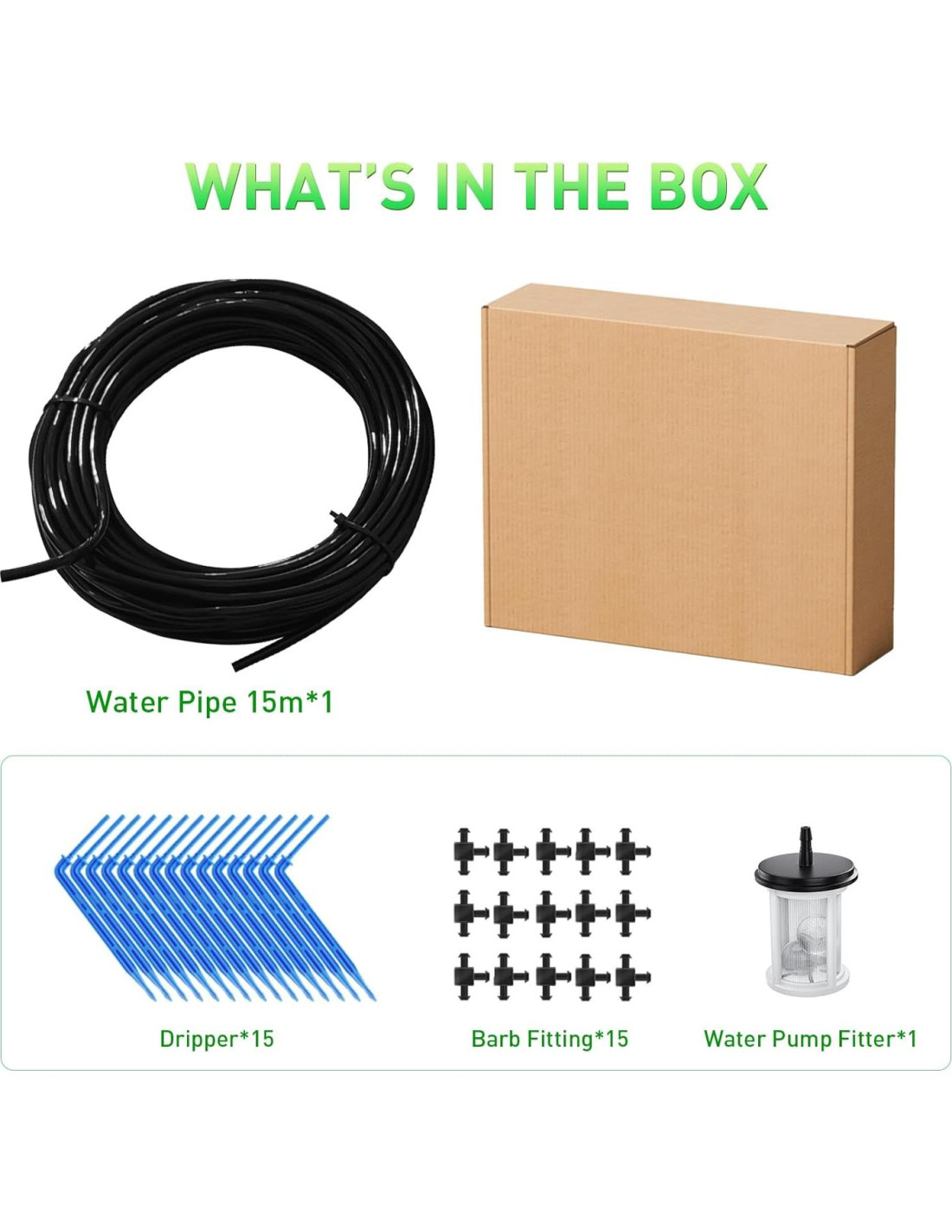 - Paquete incluido: Este es un kit de expansión o accesorios adicionales, que incluye un filtro, un dispositivo anti-sifón, 15 metros de tubería, 15 piezas de juntas en T y 15 piezas de estacas de goteo.