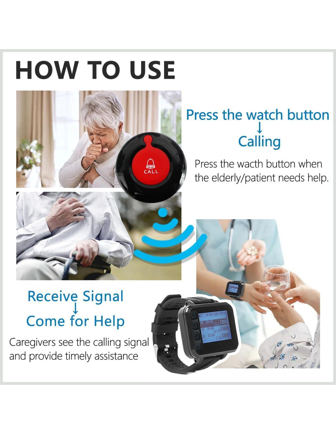 - Receptor de Reloj Inalámbrico: El pager de muñeca inalámbrico se puede mover con el cuidador y el rango de trabajo es de hasta 100 metros (328 pies) en áreas abiertas, se puede llevar a cualquier lugar. Receptor de muñeca con 4 modos de aviso por tono: sacudir y beep/beep/sacudir/silencio (solo pantalla), tiene un tiempo de espera de hasta 14 días, asegurando que nunca te pierdas una llamada de ayuda.