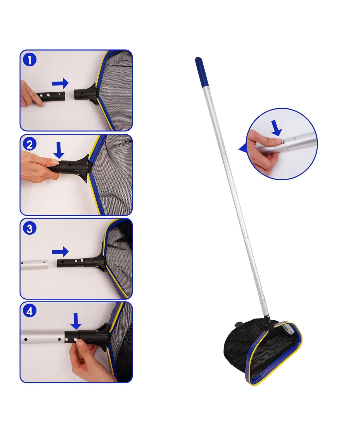 - RÁPIDO Y FÁCIL DE USAR: El mango de la red skimmer de hojas tiene botones de clip EZ que evitan que tus dedos se pellizquen o atasquen al acoplar o desacoplar un poste de piscina. Se extiende y se retrae en segundos, ayudándote incluso en lugares de difícil acceso. Se cierra completamente para un fácil almacenamiento.