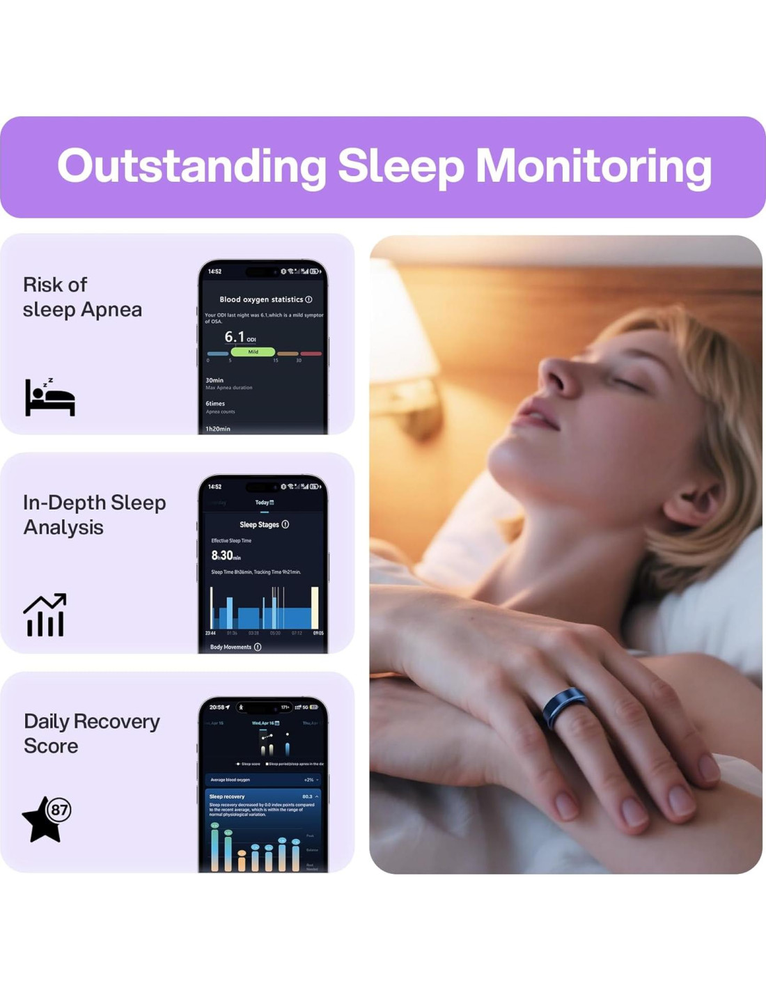 - Gestión Avanzada del Sueño y el Estrés. Toma el control de tu bienestar con un análisis detallado del sueño y monitoreo del estrés. Rastrea las etapas del sueño, seguimiento de patrones de sueño con indicadores básicos de estrés. Nuestro anillo inteligente te ayuda a encontrar el equilibrio en tu vida ocupada y asegura un descanso de calidad cada noche.