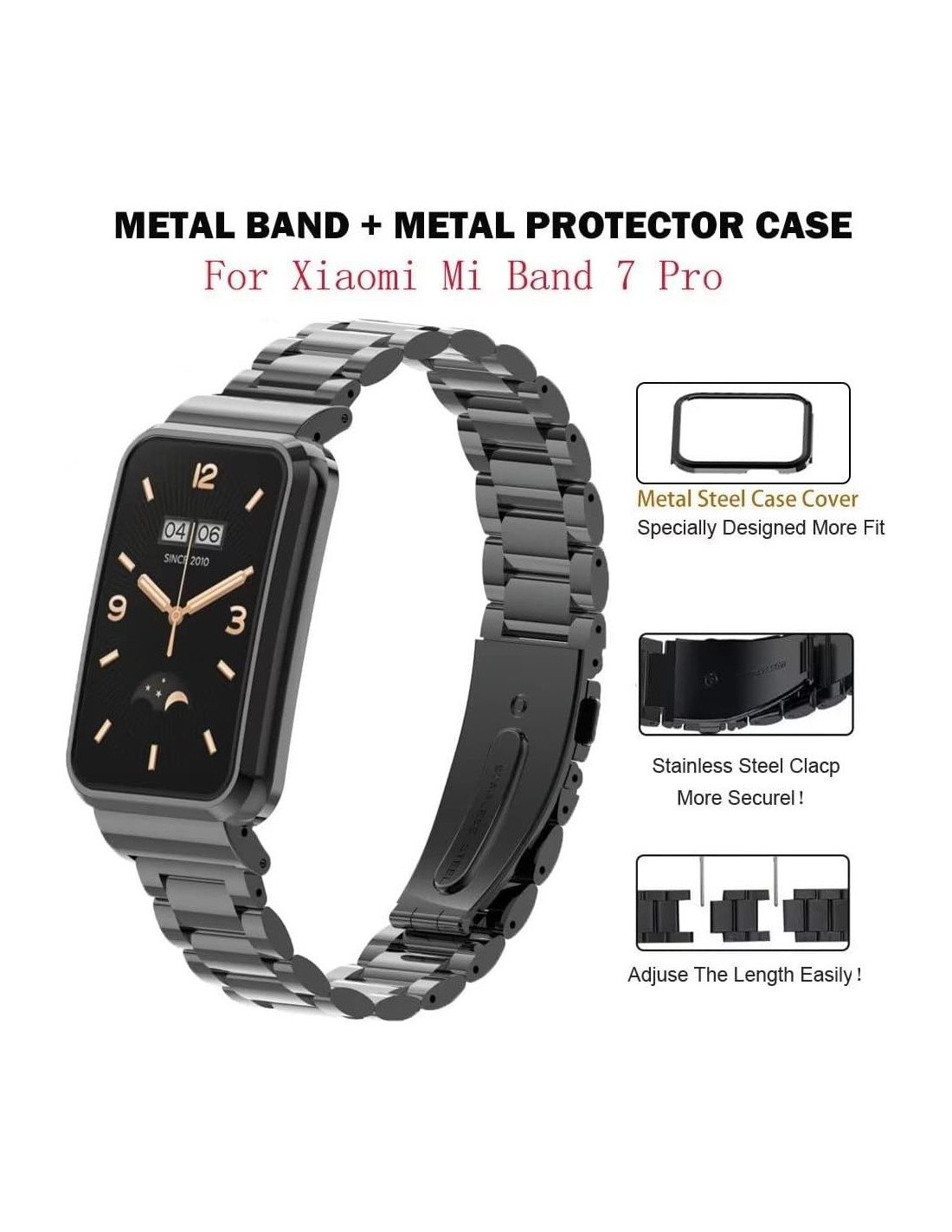 COMPATIBILIDAD: Correa de reemplazo compatible con Xiaomi Mi Band 7 Pro. Nota: sin Xiaomi Smart Band 7 Pro Health and Fitness Tracker. Instalación fácil y directa y eliminación con un botón. MATERIAL Y ARTESANÍA: Correa de muñeca hecha de acero inoxidable 304 de primera calidad, bien pulido y coloreado por galvanoplastia al vacío, no una aleación de zinc o aluminio de bajo costo, lo que la convierte en un compañero diario elegante y robusto. La correa del reloj tiene mejor transpirabilidad y previene alergias. TAMAÑO: La correa de reloj clásica y duradera está especialmente diseñada para Mi Band 7 Pro. Se adapta a muñecas de 5.5-8.1 inches (140-205 mm). El toque metálico nunca lastima tu muñeca, también es transpirable, puedes usarla en cualquier temporada y en cualquier ocasión. DISEÑO ÚNICO: El diseño del marco de metal para el reloj resuelve el problema de la correa suelta y el conector del reloj. Diseñada con un clásico cierre de doble hebilla de botón, que se puede usar firmemente y es fácil de quitar. GARANTÍA DE SATISFACCIÓN: Se proporciona una garantía de calidad de 1 año. Si tienes alguna pregunta, contáctanos sin dudarlo, te responderemos lo antes posible. Paquete: 1x Correa de Reemplazo para Xiaomi Mi Band 7 Pro
