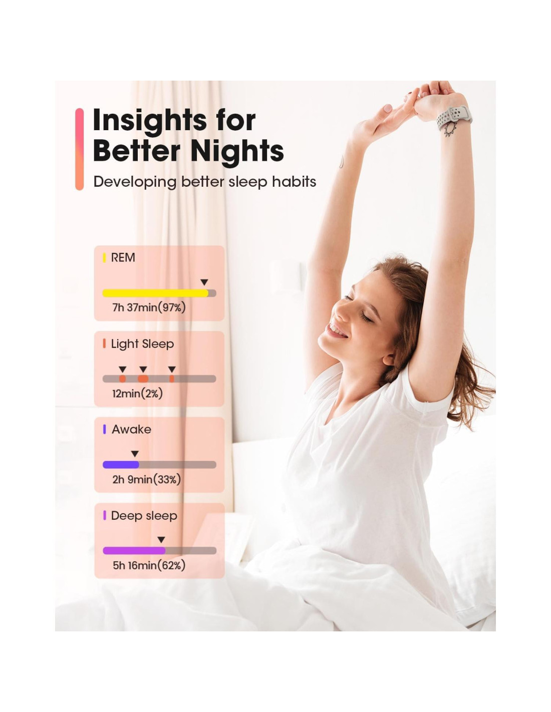 - Rastreador de Actividad de Salud 24 Horas: Prioriza tu bienestar con relojes inteligentes para hombres con monitoreo continuo de salud. Los relojes inteligentes para mujeres rastrean tu Frecuencia Cardíaca, niveles de Oxígeno en Sangre (SpO2) y patrones de Sueño (sueño profundo, sueño ligero, análisis REM, mejora tus hábitos de sueño al ver tus datos de sueño) las 24 horas. Toma el control de tu bienestar y toma decisiones informadas para un estilo de vida más saludable.