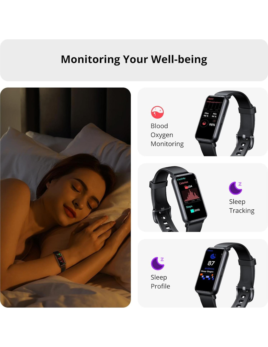 - Perspectivas de Salud Integrales, Todo el Día: Mantente al tanto de tu bienestar con nuestro rastreador de fitness de vanguardia. Rastreará diligentemente tus pasos diarios, distancia recorrida y quema de calorías, mientras que sensores avanzados monitorean constantemente tu frecuencia cardíaca, patrones de sueño, Monitoreo de Oxígeno en Sangre y niveles de estrés. Sincronizando todos los datos con tu smartphone, puedes profundizar en un análisis integral que proporciona profundas perspectivas sobre tu salud. Haz ajustes informados en tu estilo de vida a medida que obtienes una comprensión profunda de tu bienestar, poniéndote en control de tu viaje de fitness como nunca antes.