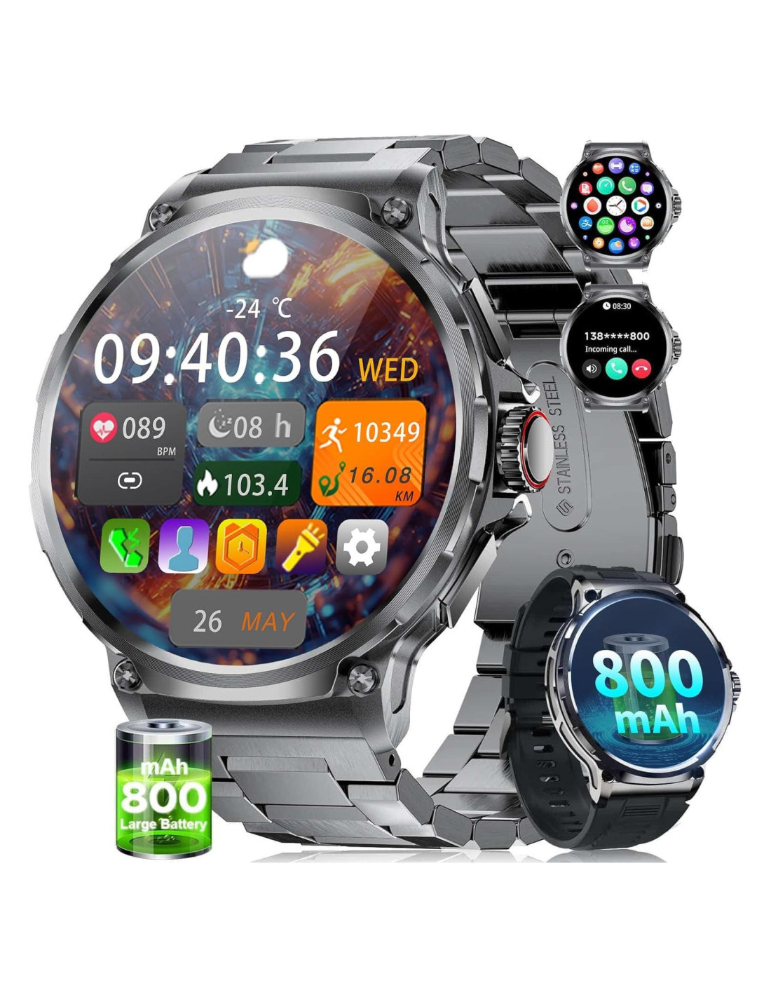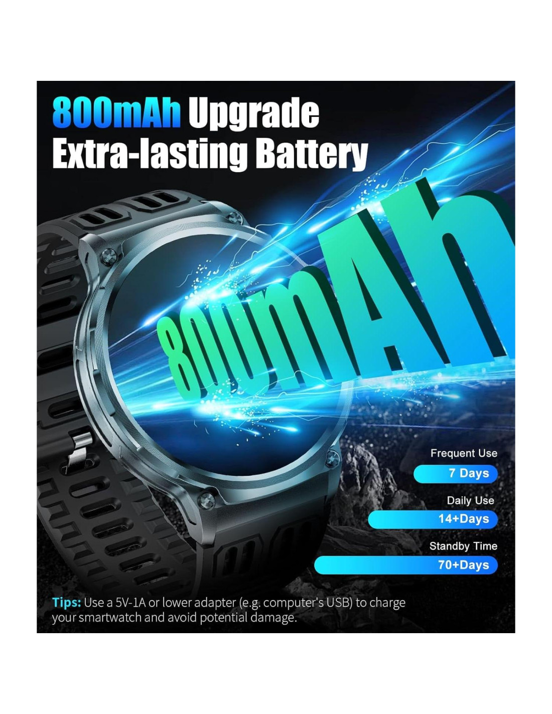 - Reloj Inteligente Grande de 1.85'' y 300 UI Exquisitas. El reloj inteligente militar está equipado con una pantalla IPS de 1.85 pulgadas sobresaliente. Puede presentar colores vívidos de alta resolución incluso bajo la luz solar directa o en entornos al aire libre, asegurando una claridad visual inigualable. Su diámetro es de aproximadamente 55 milímetros, lo que permite a los hombres con dedos más gruesos operar fácilmente la gran pantalla. Está especialmente diseñado para hombres con muñecas más anchas. Hay casi 300 UIs en línea para que elijas en la APP.