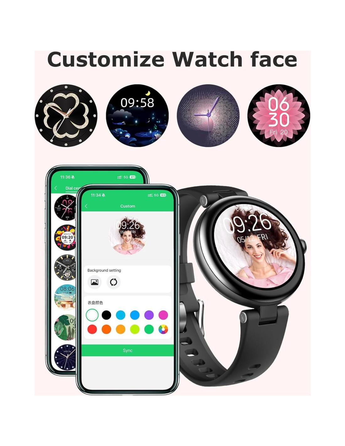 - Relojes de Fitness para Mujeres y Caras de Reloj Personalizadas: El reloj de fitness SHANG WING LYNN adopta una forma redonda clásica con un diseño de apariencia exquisita, convirtiéndolo en un reloj único y elegante solo para mujeres. Puedes personalizar las caras del reloj libremente con tus fotos o diales existentes para adaptarse a tu estado de ánimo y estilo de atuendo.