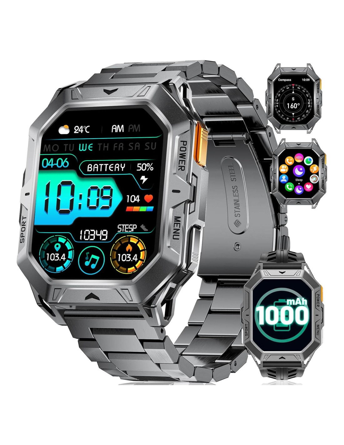 - [Impermeable hasta 5ATM y 2 Correas] Este reloj inteligente resistente cuenta con una clasificación de impermeabilidad de 5ATM, lo que lo hace adecuado para diversas actividades en cualquier clima. Viene con un cuerpo metálico completamente cerrado, convirtiéndolo en tu compañero perfecto ya sea que estés aventurándote al aire libre o conquistando la jungla urbana. El diseño elegante y la forma clásica, combinados con una correa de acero inoxidable elegante, lo hacen perfecto para ocasiones de negocios y formales. Para deportes o entrenamientos, puedes cambiar a la correa de silicona incluida.