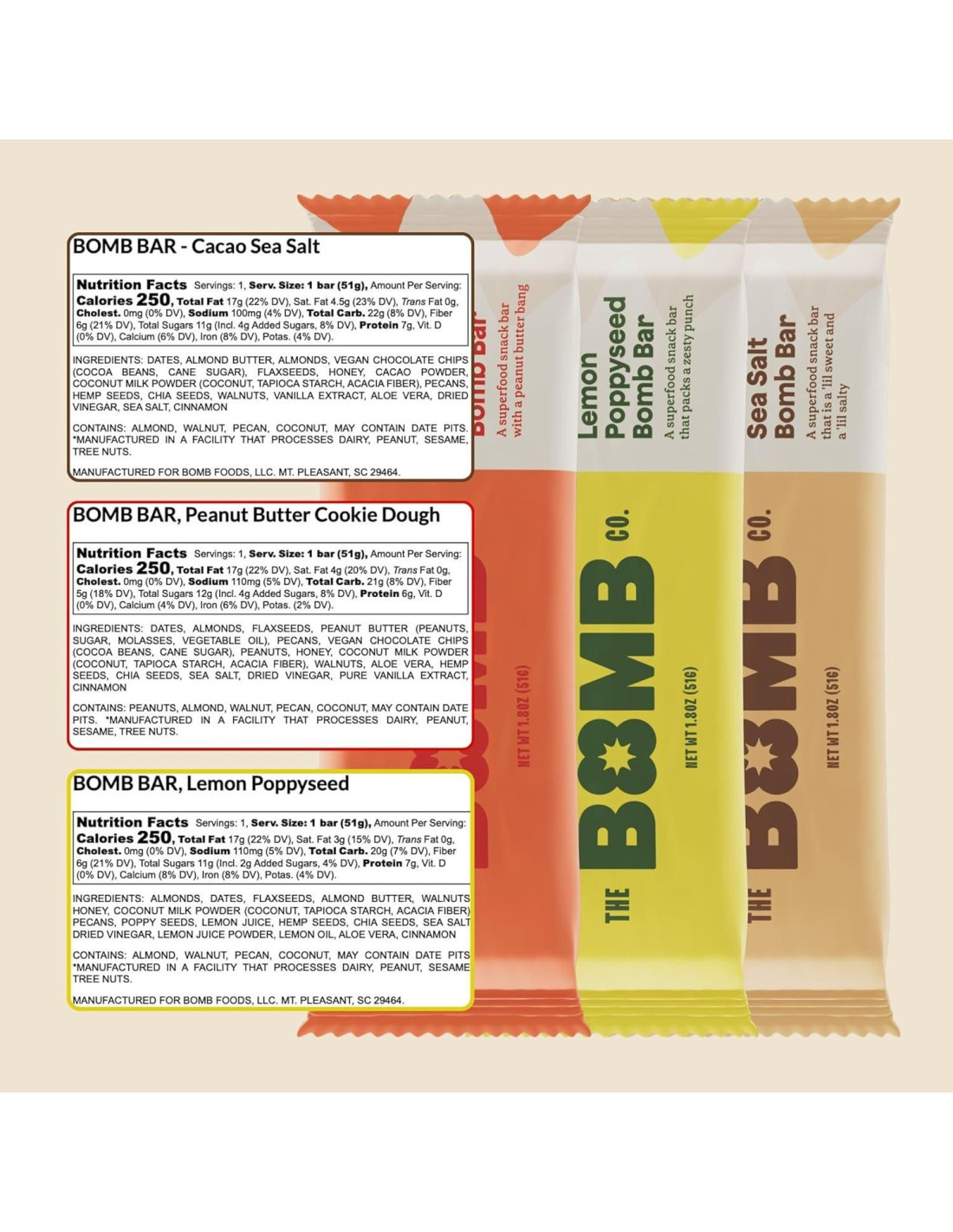 - SNACKS SALUDABLES FÁCILES Y CÓMODOS: Llenas de superalimentos y con mucho sabor, cada Barra Bomb ofrece un golpe denso en nutrientes para un snack deliciosamente saludable para llevar. Enciende tu mecha con la magia de The Bomb Co. probando todos los sabores de la Barra Bomb: Masa de Galleta de Mantequilla de Maní, Semilla de Amapola de Limón y Cacao con Sal Marina!