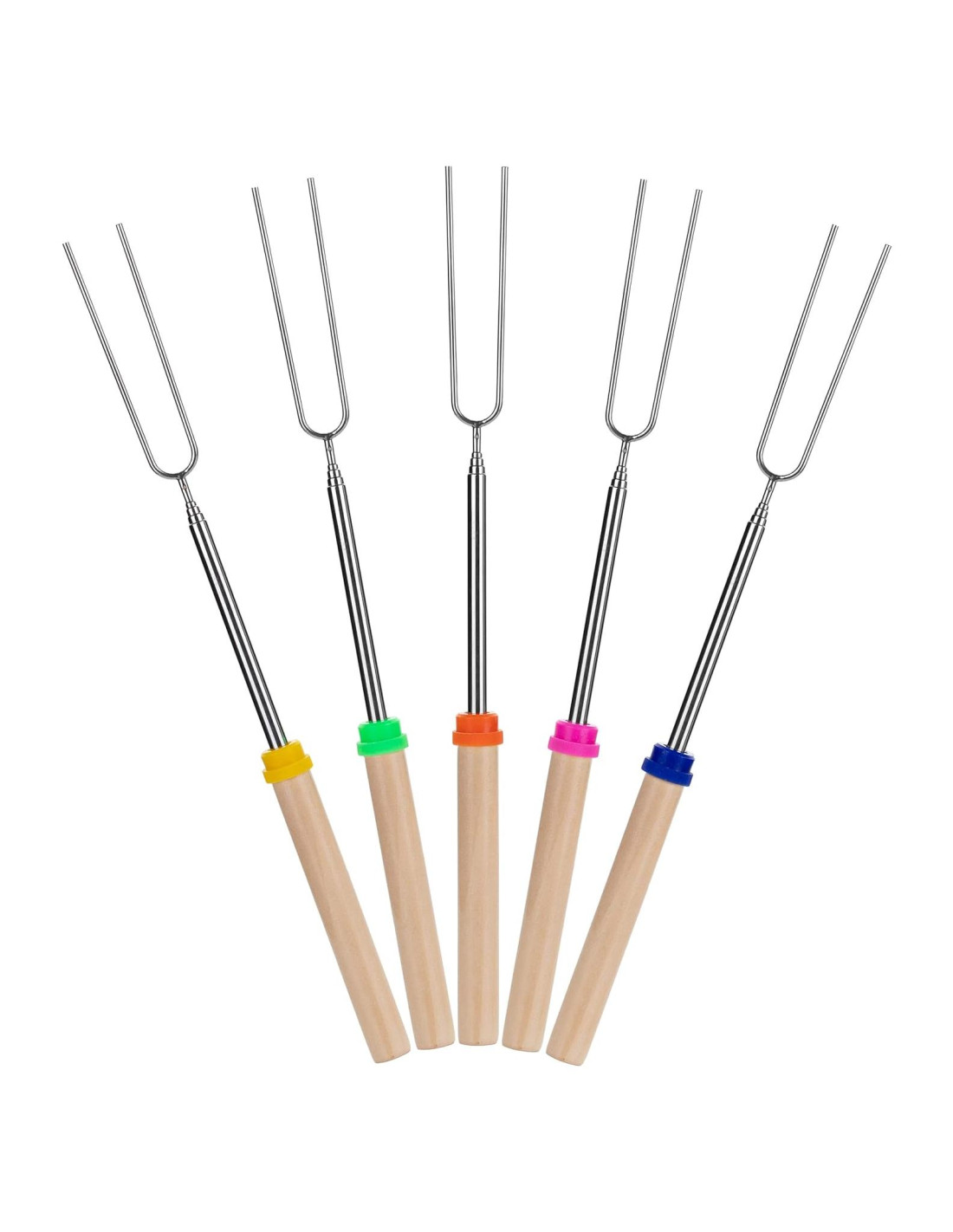 - El paquete incluye 5 palos telescópicos para asar malvaviscos para tu próxima fogata. El tenedor está hecho de acero inoxidable, y el mango es de madera, lo que lo hace apto para alimentos, a prueba de óxido, resistente al calor y a la corrosión.