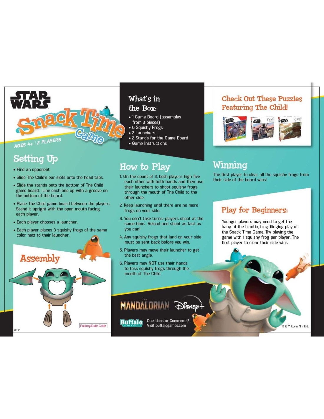 Juego de Snack de Star Wars El Mandaloriano. ¡Es hora de un snack para un adorable alienígena hambriento en este juego que presenta al Niño de la serie de Disney+, El Mandaloriano! Lanza ranas blandas a través de la boca del Niño hacia el jugador del otro lado. Ambos jugadores compiten para despejar su lado del tablero primero. No se toman turnos, ambos jugadores juegan al mismo tiempo en este rápido juego de lanzamiento de ranas. ¡Protege! ¡Ataca! ¡Snack!