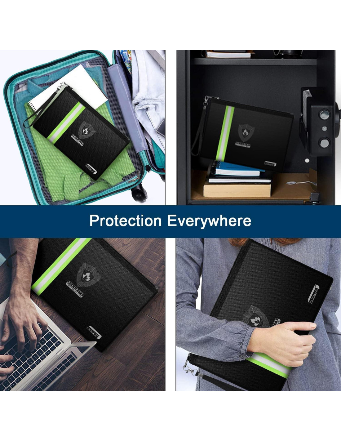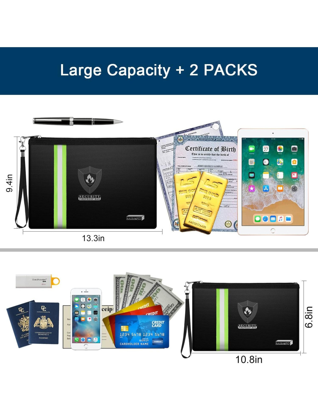- TAMAÑO GRANDE Y GRAN CAPACIDAD - 2 BOLSAS: Bolsa a prueba de fuego de gran capacidad de 13.3x9.4 pulgadas (33.8x23.9 cm) y bolsa pequeña adicional de 10.8x6.8 pulgadas (27.4x17.3 cm). Dos tamaños de bolsas de documentos a prueba de fuego te dan suficiente espacio para clasificar y almacenar tus documentos. La bolsa de archivo grande tiene un bolsillo especial para almacenar varias tarjetas. Te permite preservar y organizar mejor tus diversos documentos, recibos, efectivo, fotos, pasaportes, llaves, joyas y otros objetos de valor.