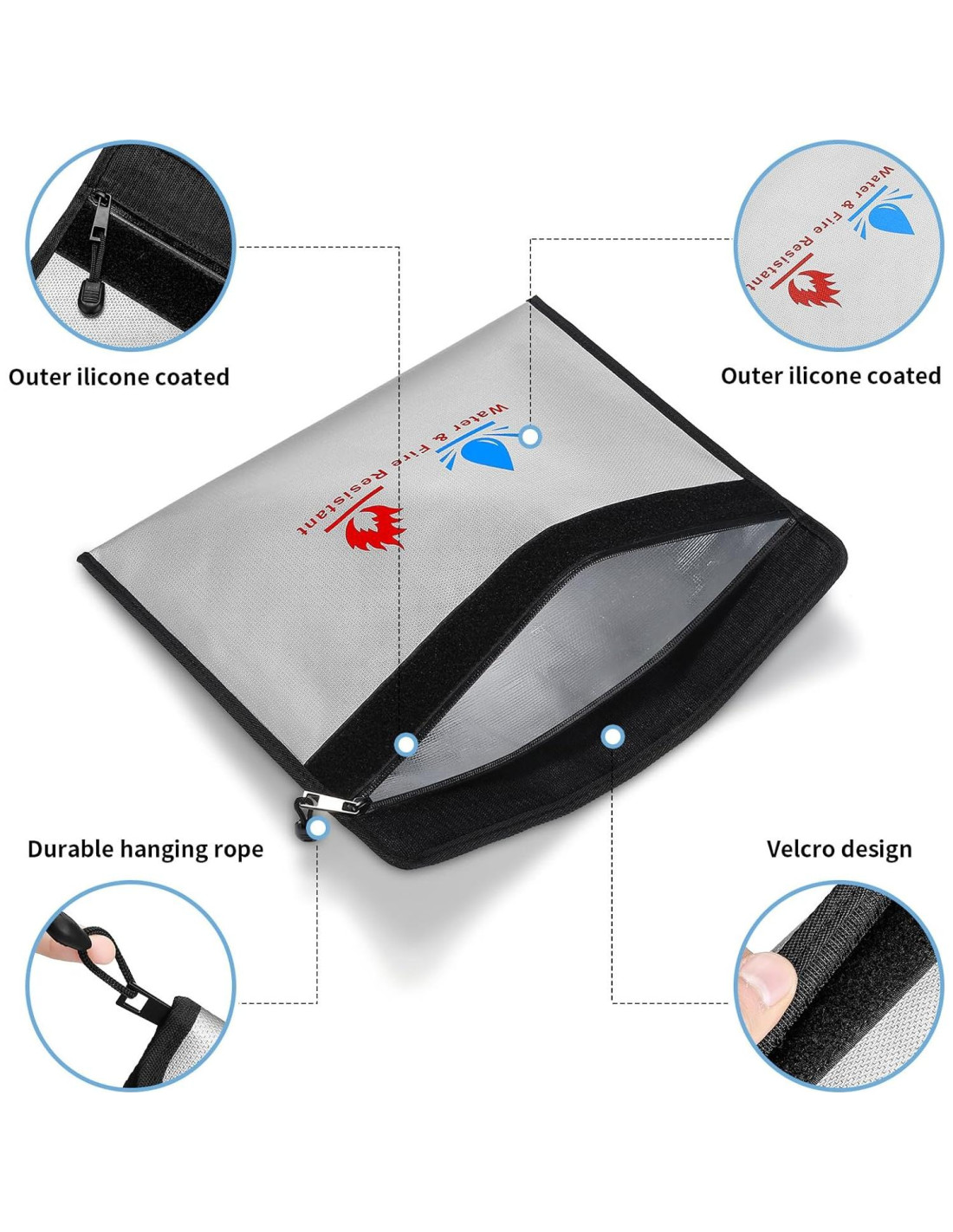 - A Prueba de Fuego y Resistente al Agua: Hecha de un exterior de fibra de vidrio retardante recubierto de silicona de alta calidad y un interior de papel de aluminio, que puede soportar temperaturas de hasta 2000F (1093.33C). Nuestras bolsas no solo son a prueba de fuego, sino también altamente resistentes al agua (IP 56), por si acaso se mojan por cualquier razón