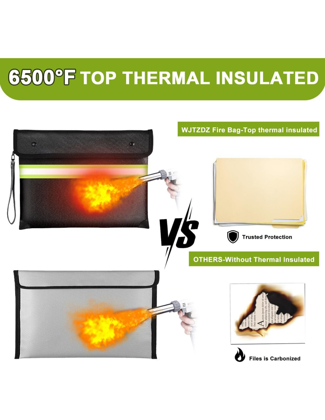 - (Nota) Ignífugo no significa que puede resistir un fuego prolongado, e impermeable no significa que puede sumergirse en agua durante mucho tiempo. Solo le da suficiente tiempo para rescatar sus objetos de valor. 6500F Top Ignífugo La bolsa ignífuga mejorada ha pasado el estándar global de inflamabilidad (laboratorio de EE. UU.) y la prueba de combustión vertical (SGS UL94 V-1) y puede resistir temperaturas de hasta 6500F (3577C), superando con creces la temperatura típica de un incendio.