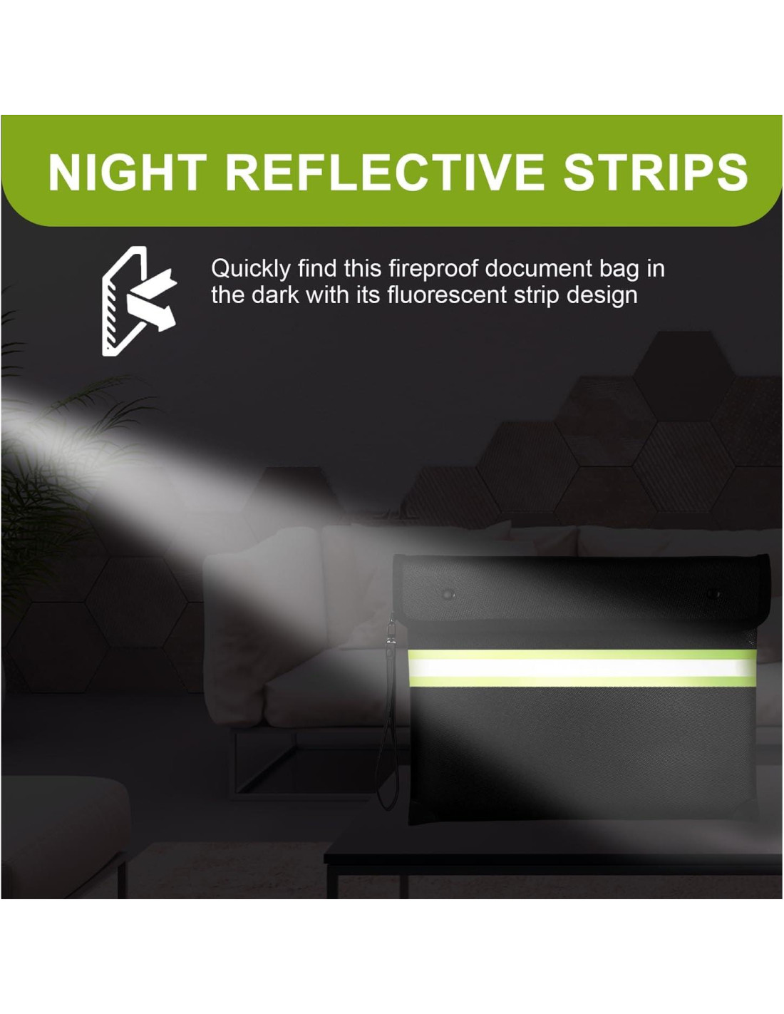 - Top Ignífugo e Impermeable La bolsa de documentos ignífuga está cosida con hilo retardante de llama y dobladillo resistente al fuego para evitar que las llamas dañen la bolsa ignífuga desde los bordes, y tiene una franja reflectante de dos colores única de doble cara, lo que le permite encontrarla fácilmente en la oscuridad. La cremallera impermeable sellada, combinada con el diseño de solapa de Velcro, puede resistir el rociado a alta velocidad de la manguera contra incendios y evitar que el fuego, el calor y el humo entren en la bolsa ignífuga.