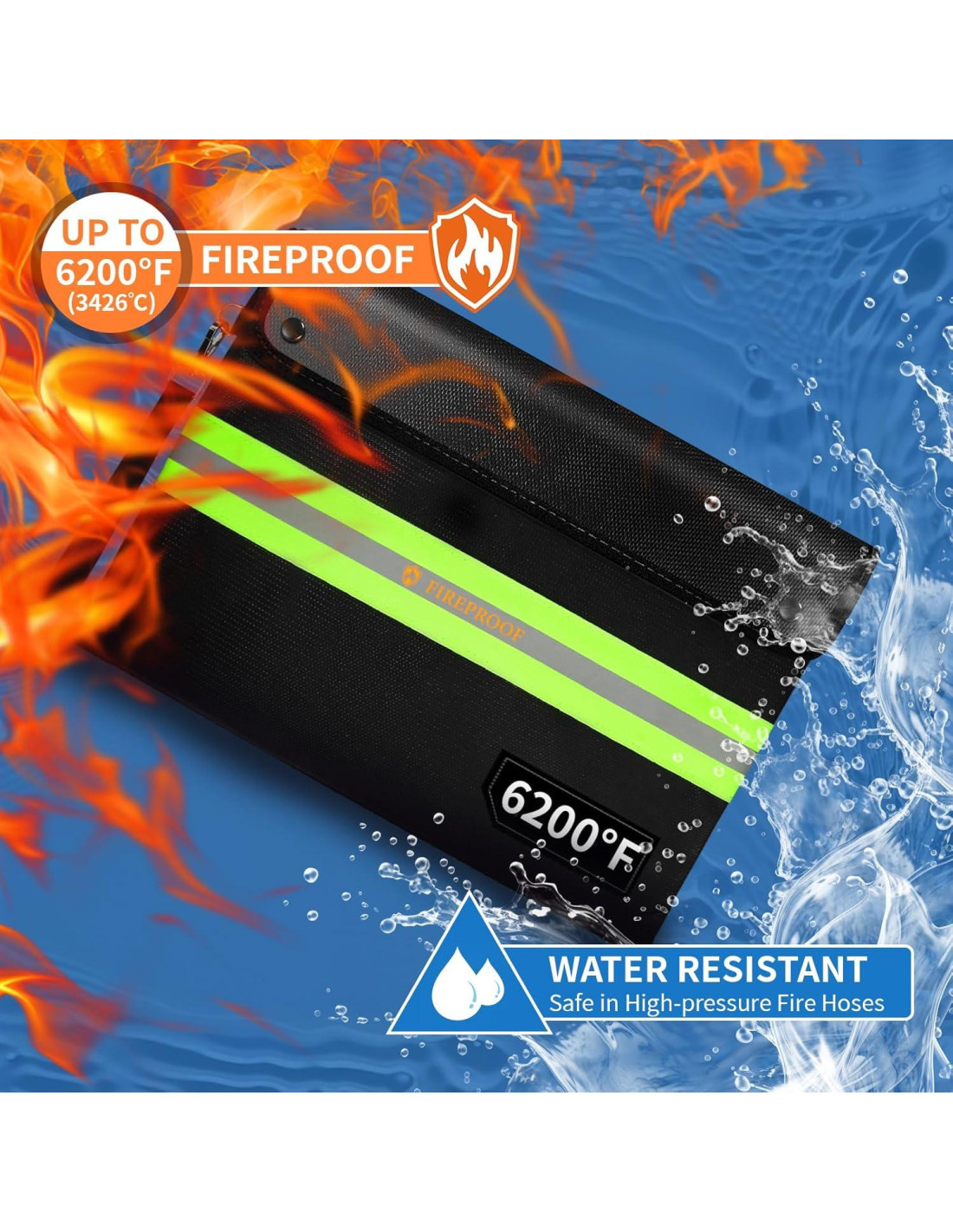 PROTECCIÓN DE SEGURIDAD: ( Tamaño Interior: 35.56 cm x 25.4 cm ) Bolsa de documentos a prueba de fuego con cerradura tiene una estructura mecánica de cerradura de combinación triple, la confidencialidad es alta para garantizar la seguridad de los documentos internos y bienes valiosos. PROTECCIÓN CONTRA FUEGO DE 6200F: La bolsa a prueba de fuego mejorada puede soportar temperaturas ultra altas de hasta 6200F (3432C). Vale la pena mencionar que la tira reflectante de la bolsa de efectivo a prueba de fuego tiene alta visibilidad por la noche, lo que es conveniente para que la encuentres rápidamente en un incendio. DISEÑO A PRUEBA DE FUEGO 360: Esta bolsa de documentos a prueba de fuego adopta principalmente una estructura de material funcional de 9 capas de protección contra fuego y aislamiento térmico. La bolsa de dinero a prueba de fuego para efectivo está cosida con hilo retardante de llama y dobladillo a prueba de fuego, para evitar que el fuego dañe la bolsa a prueba de fuego desde el borde, cierre con solapa de velcro, más dos broches metálicos a prueba de fuego, de modo que su cremallera prevenga completamente el fuego, lo que hace que la bolsa de dinero a prueba de fuego para efectivo sea resistente al fuego 360. ESTRUCTURA ÚNICA DE DECAYO TÉRMICO: Gracias a las 9 capas mejoradas de materiales funcionales con aislamiento térmico, la bolsa de documentos a prueba de fuego y agua puede soportar altas temperaturas de hasta 6200F (3432C), y el diseño anidado único permite que la bolsa a prueba de fuego tenga espacio independiente entre las capas de materiales, de modo que la transferencia de calor de los diferentes medios de contacto no directo se debilite constantemente, bloqueando la transferencia de calor. La caja a prueba de fuego te da suficiente tiempo para salvar tus bienes valiosos del fuego. RESISTENCIA AL AGUA SUPERIOR: La bolsa de dinero a prueba de fuego contiene tres capas de material impermeable, lo que puede proporcionar una garantía confiable de rendimiento a prueba de agua. Además, la bolsa de dinero a prueba de fuego para efectivo cuenta con una cremallera impermeable profesional y cerradura de código, cierre con solapa de velcro, tratamiento impermeable estricto en las costuras de los bordes, puede soportar chorros de alta velocidad de manguera contra incendios, y prevenir que el fuego, el calor y el humo entren en la bolsa a prueba de fuego.