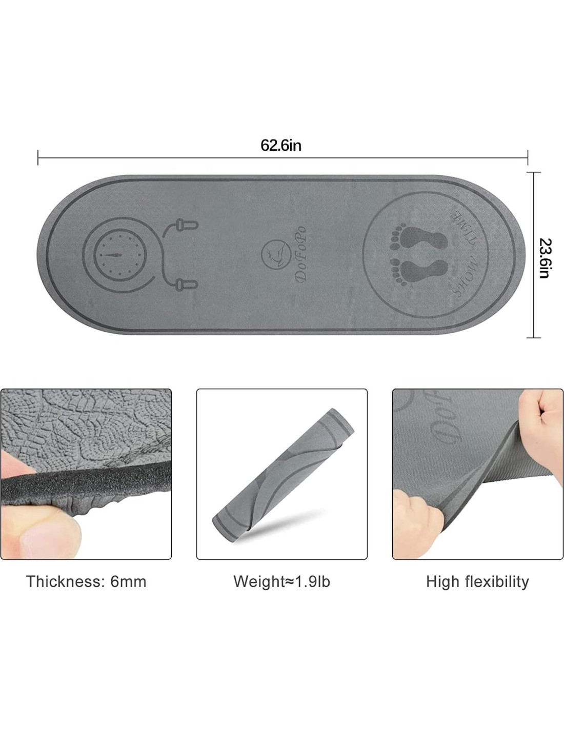 Las principales inspiraciones detrás de la creación de nuestra alfombrilla fueron extender la vida de tus cuerdas para saltar y proteger tus pisos de los golpes duros de la cuerda. Mientras que nuestra alfombrilla presenta un diseño ovalado único, para un almacenamiento fácil y un rendimiento óptimo al saltar, sigue siendo lo suficientemente ancha y larga para atrapar todos tus golpes y asegurar que tu cuerda siempre haga contacto con la alfombrilla. Cuando tu cuerda golpea la alfombrilla, la estás protegiendo del duro suelo y los elementos mientras proteges simultáneamente tus delicados pisos interiores. Sabemos lo aburridas y monótonas que son las alfombrillas de ejercicio típicas, por lo que queríamos que la alfombrilla DOFOPO Fitness tuviera un aspecto fresco y moderno que no se parezca a todo lo demás. Así es, ¡no verás una alfombrilla negra aquí! Nuestra alfombrilla tiene un color gris elegante que es vibrante y está impresa con nuestro logo que se ve genial y seguramente destacará como tuya.