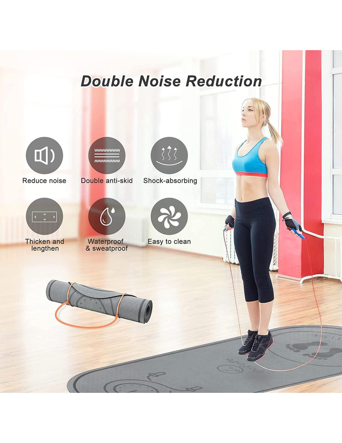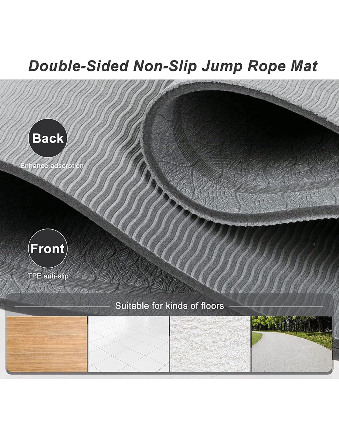 - Antideslizante y Absorción de Choque: La alfombrilla para saltar cuerda antideslizante de doble cara tiene un diseño de superficie texturizada que puede aumentar la fricción, y el material ecológico reduce el ruido, evitando efectivamente molestar a la familia y vecinos cuando saltas cuerda o haces ejercicio en interiores