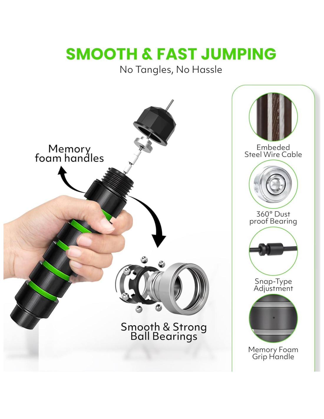 - Saltos Sin Enredos y Suaves: Con un rodamiento de bolas a prueba de polvo de 360 grados y un fuerte cable de acero embebido en el núcleo, esta cuerda de saltar para hombres asegura saltos suaves y fáciles sin enredos a cualquier velocidad.