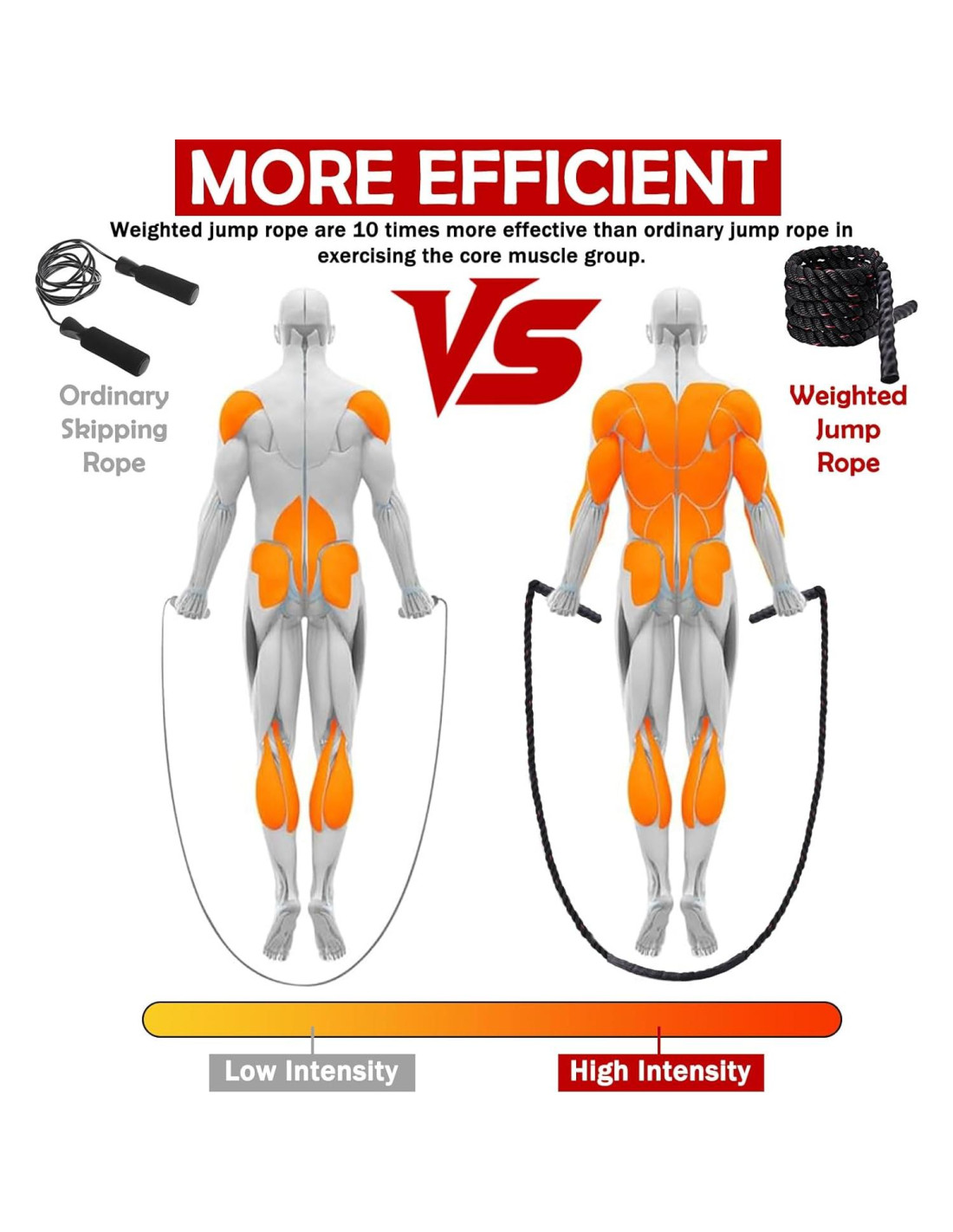 - [Cuerda de Salto con Peso] Esta cuerda de salto pesada es 10 veces más eficiente para trabajar tus músculos centrales que una cuerda de salto ordinaria. Usar las cuerdas con peso para saltar una vez equivale a saltar 10 veces con una cuerda de saltar ordinaria. Utiliza la gravedad para aumentar la intensidad del ejercicio, lo que nos ayuda a lograr resultados de ejercicio ideales en un tiempo más corto.