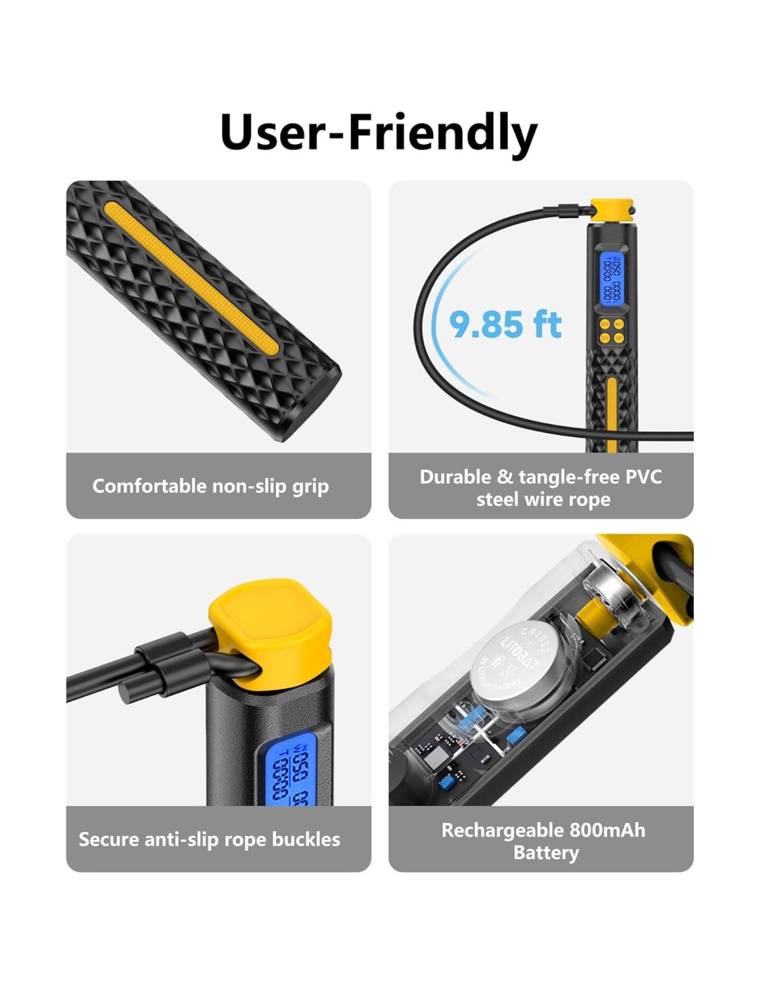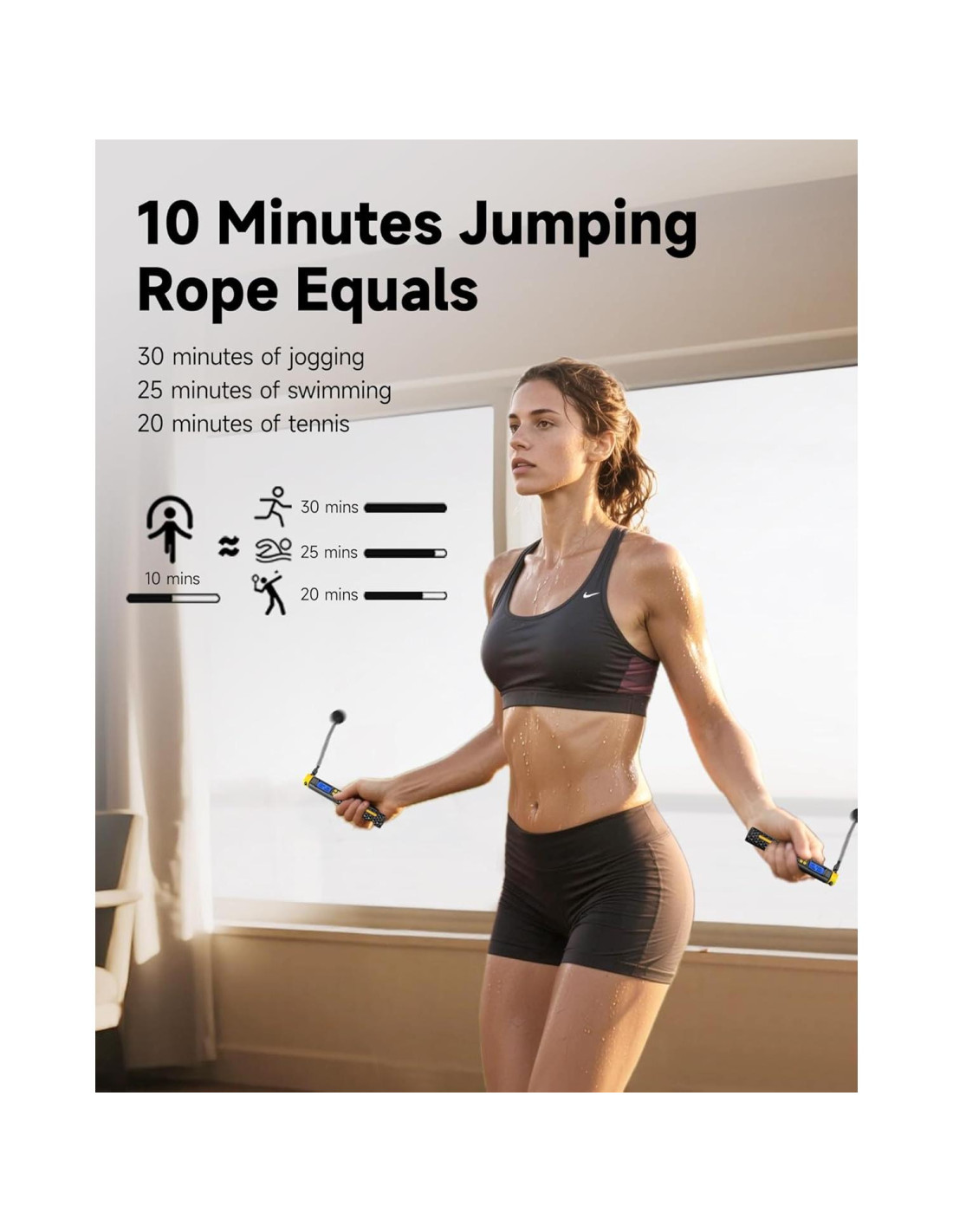 - Conteo Automático, Enfoque Puro: Obtén control inteligente y rastrea automáticamente tu progreso de entrenamiento desde la gran pantalla LED, incluyendo el conteo de saltos, la duración del entrenamiento y la quema estimada de calorías. Monitorea tu rendimiento y planifica tu viaje de fitness con datos claros al alcance de tu mano.