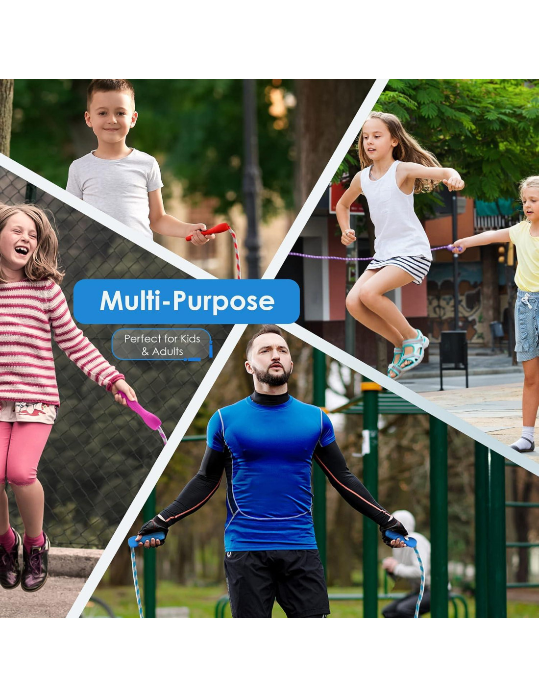 - AMPLIA GAMA DE USO - La cuerda de salto ligera y portátil es excelente para usar en la escuela, gimnasio, jugando o en casa. La cuerda de salto para fitness es un juguete y equipo de salto para niños que les ayuda a desarrollar habilidades motoras grandes y mantenerse en forma. La cuerda de salto larga es segura para usar con múltiples propósitos y es ideal para regalos de fiesta. La cuerda de salto de velocidad es perfecta para regalos de Navidad para tu hija y nietas.