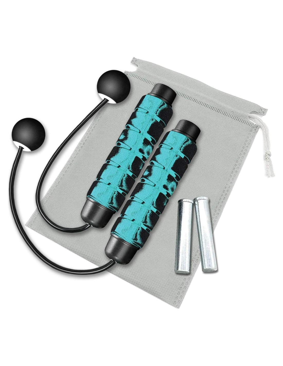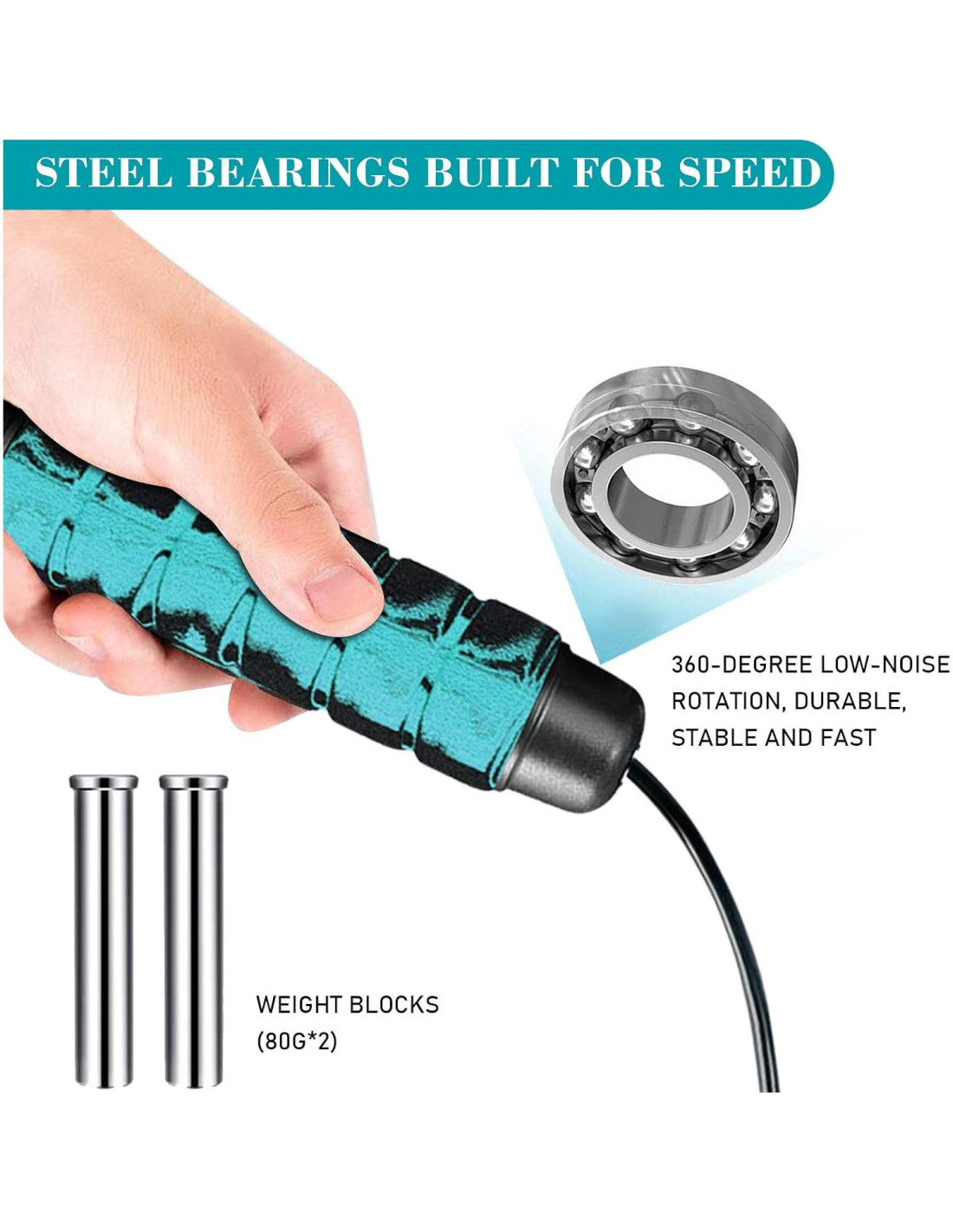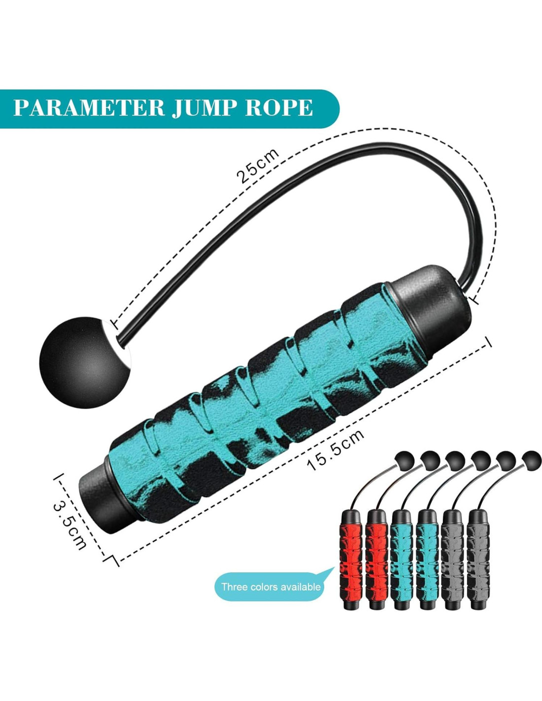 - Mangos con peso y cómodos - puedes agregar bloques de hierro con peso según tus necesidades, cada uno pesa 80g, lo que hace que toda la cuerda de salto pese 0.32 kilogramos. Esto hará que todo el proceso de saltar con la cuerda esté bajo carga, consumiendo más energía. El mango es de material suave y cómodo de PP+EVA espuma, hecho de tecnología de extrusión de tóner, que es un graffiti improvisado. Absorbe el sudor y tiene cierta fuerza de fricción. Cuando saltas rápidamente, puede adherirse muy bien a tu mano.