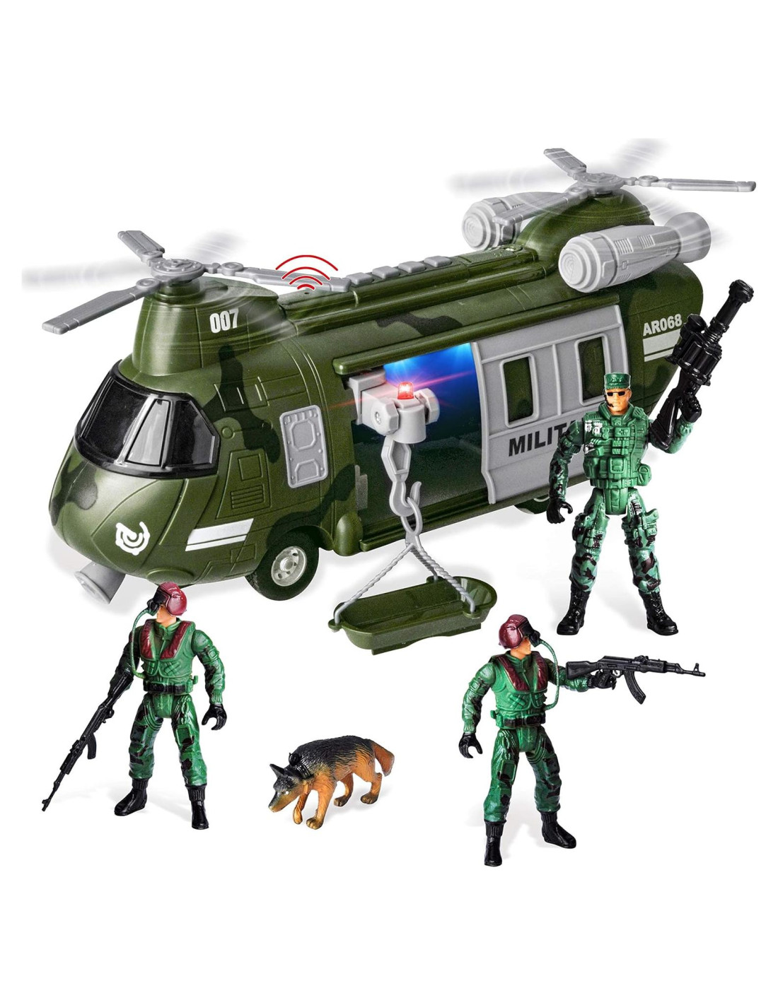 - PAQUETE DE SUPER VALOR. Nuestro Conjunto de Juguetes del Ejército incluye 1 Helicóptero de Transporte, 3 figuras de acción militares, 1 figura de perro y accesorios. Cada vehículo mide aproximadamente 9 pulgadas (22,86 cm) de largo; cada figura de soldado mide aproximadamente 4 pulgadas (10,16 cm) de alto.