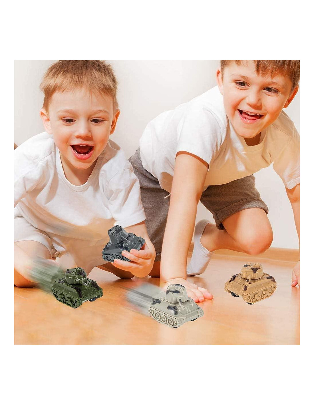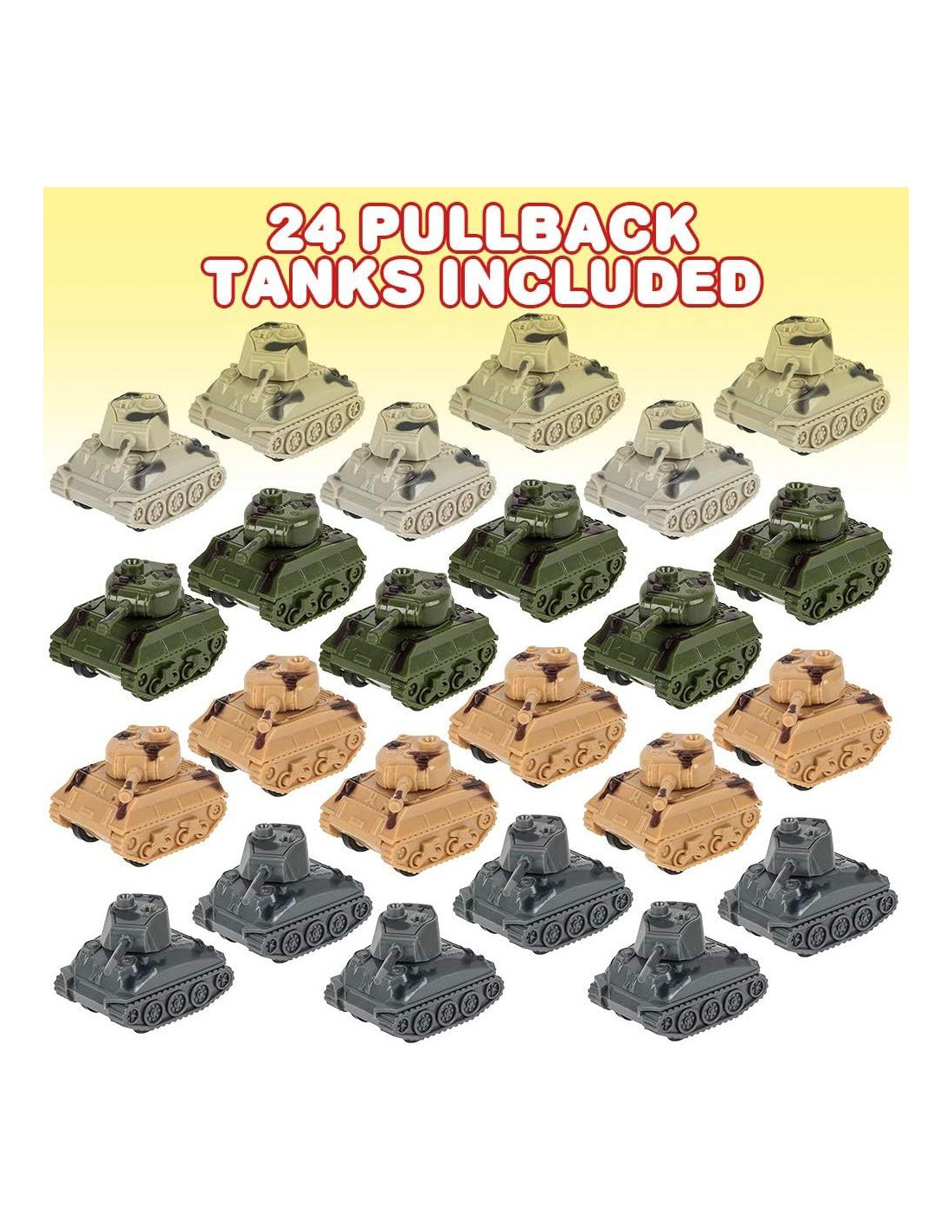 - PAQUETE AL POR MAYOR DE 24: ¡Haz sonreír a esos pequeños amantes de la acción mientras obtienes el mejor valor por tu dinero! Este conjunto viene con un total de 24 mini tanques de ejército retroceder con un aspecto realista y en 4 colores diferentes (6 de cada uno). La torreta de los tanques incluso gira para un juego imaginativo verdaderamente inmersivo.