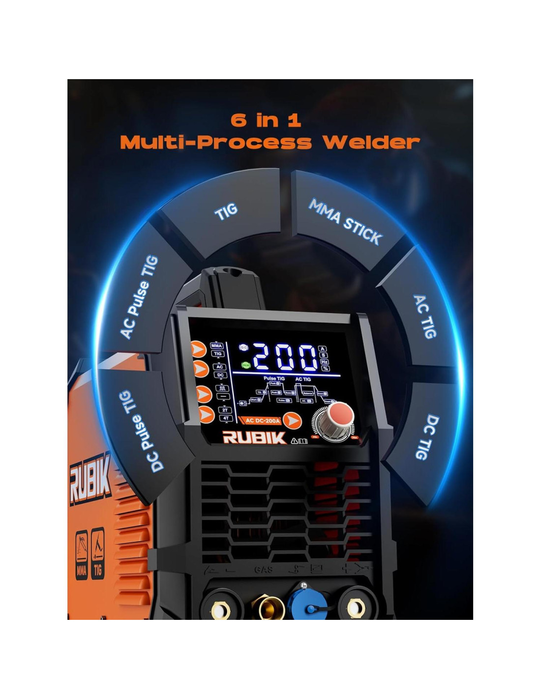 - Modos de Soldadura 6 en 1: El soldador RUBIK ACDC TIG200 integra 6 modos de soldadura, incluyendo MMA STICK/TIG/AC TIG/DC TIG/AC Pulso TIG/DC Pulso TlG. Ya sea soldadura DC de alta precisión o soldadura por pulso AC de piezas de trabajo complejas, esta máquina de soldadura satisface tus necesidades