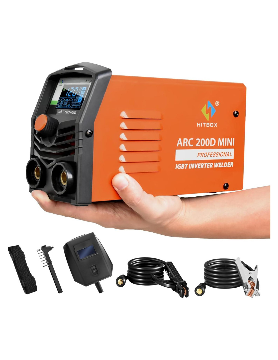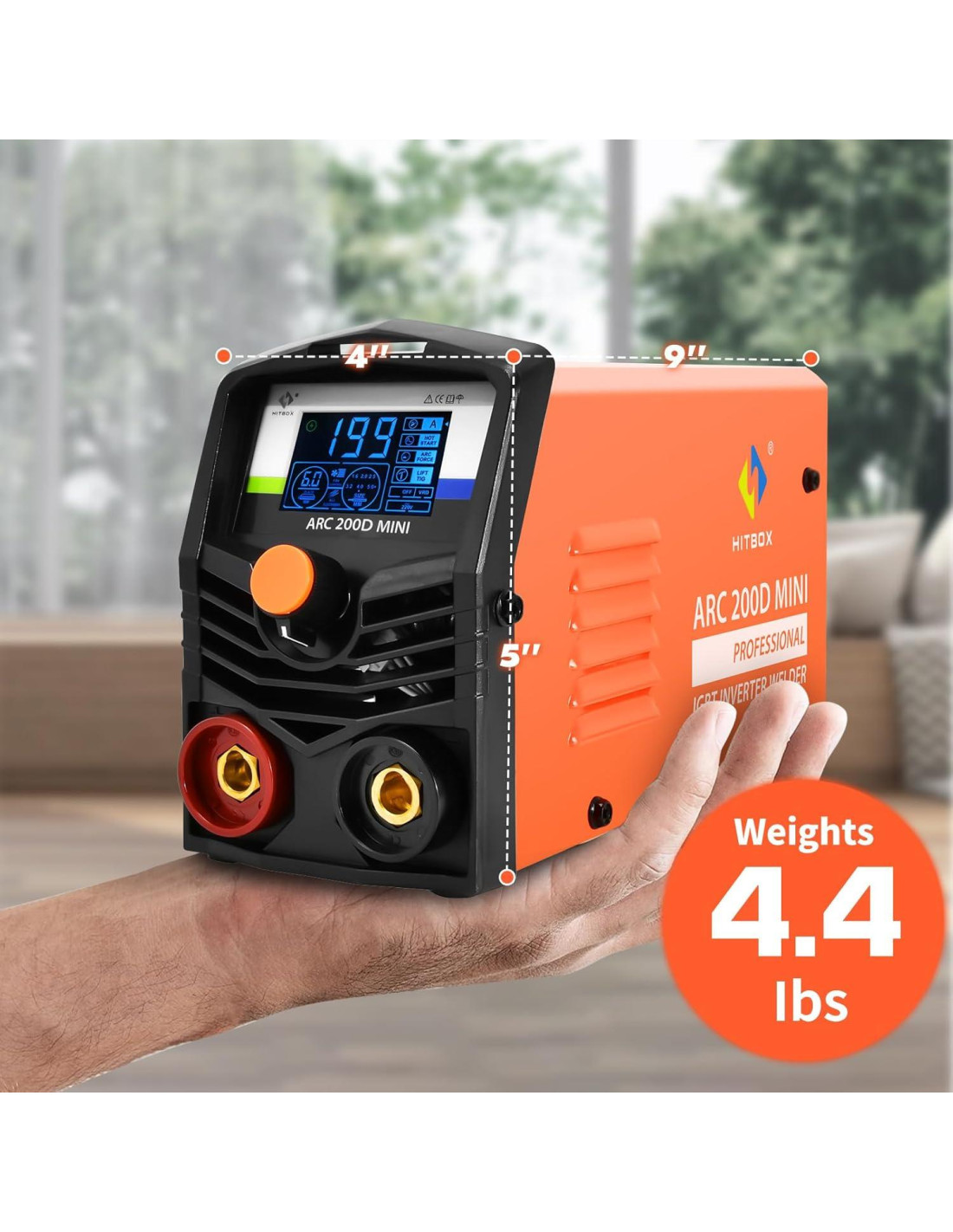 - Soldador ARC Ultra-mini Portátil La máquina de soldadura es compacta y ligera. Dimensiones: 9*5*4 pulgadas (22,86*12,7*10,16 cm), Peso: 4.4 lbs (1,99 kg). El soldador de varilla tiene una correa de hombro ajustable fácil de llevar para facilitar el transporte o uso entre sitios de trabajo. HITBOX ARC200D tiene equipo de protección incorporado internamente para prevenir sobrecalentamiento y sobrecorriente para asegurar una operación segura.