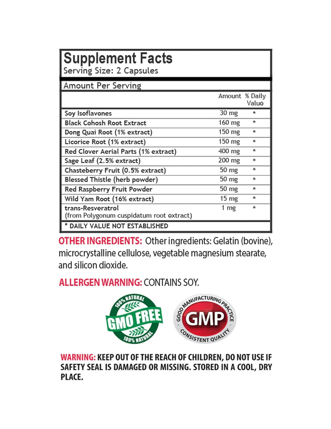 COMPLEJO DE SOPORTE PARA MUJERES - Mezcla Aérea de Trébol, Extracto de Raíz de Cohosh Negro, Cardo Bendito Certificado, Fruto de Frambuesa Roja, Extracto Estandarizado de Cohosh, Extracto de Planta de Resveratrol, Hoja de Salvia, 2Bot