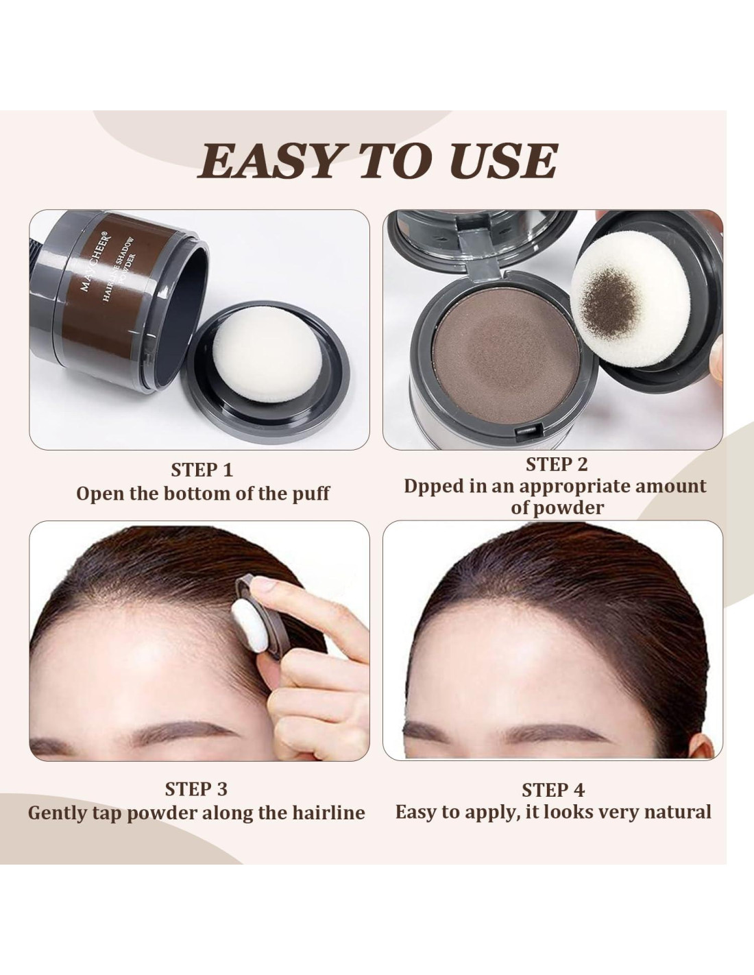 - [Cómo Usar] El polvo para toque de raíces Maycheer es fácil de usar. Solo toma tres pasos para completar la modificación del peinado. El primer paso es encontrar el área que necesita ser rellenada. El segundo paso es tomar una pequeña cantidad de polvo y aplicarlo en el maquillaje. El tercer paso es aplicarlo a lo largo de la textura del cabello para un efecto natural y desordenado.