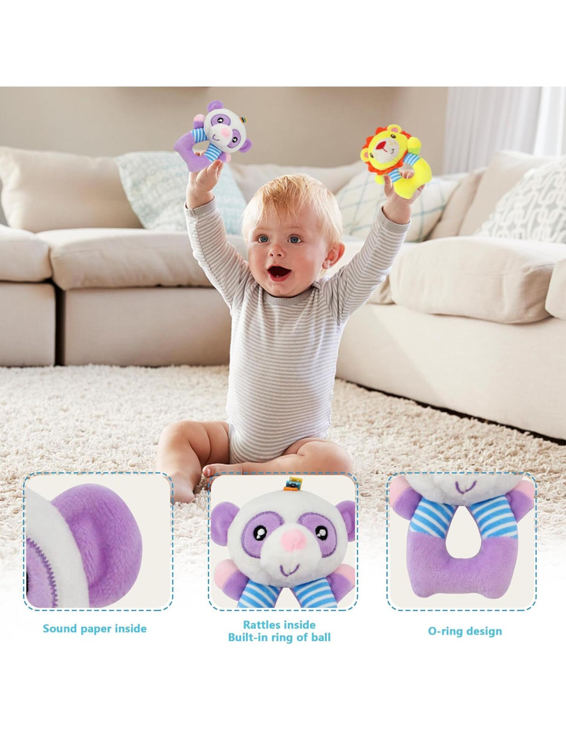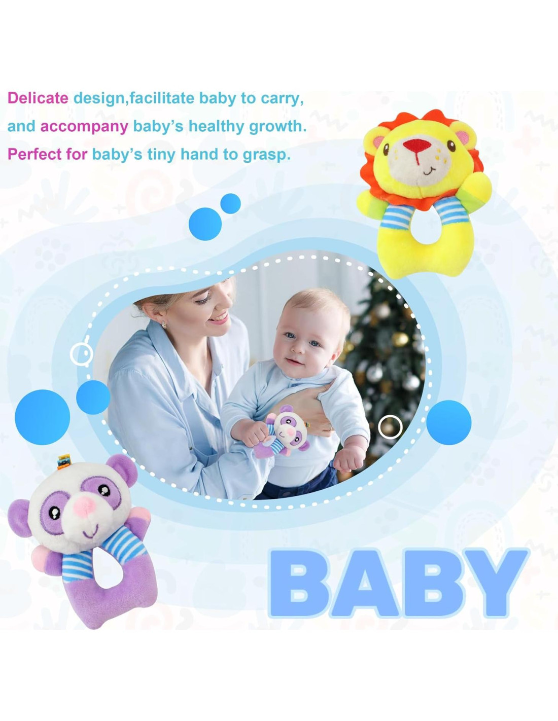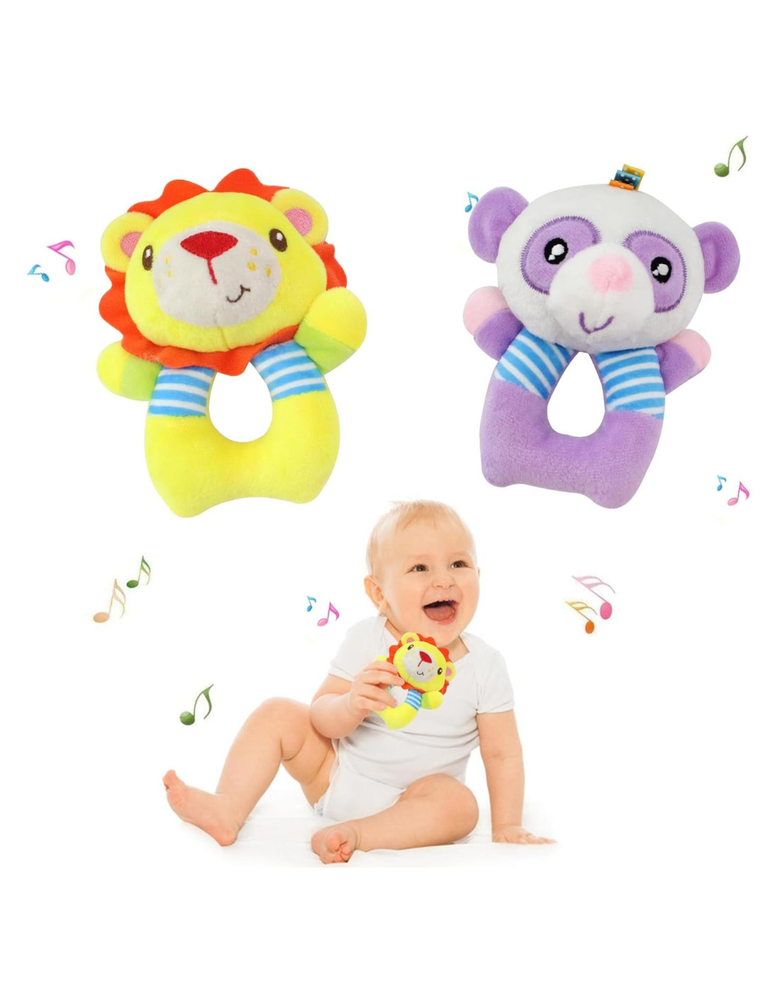 - [Juguete sonajero suave] : Estos juguetes sonajeros de bebé de felpa están hechos de felpa con relleno de algodón PP suave, y son cómodos, se recomienda lavar a mano.
