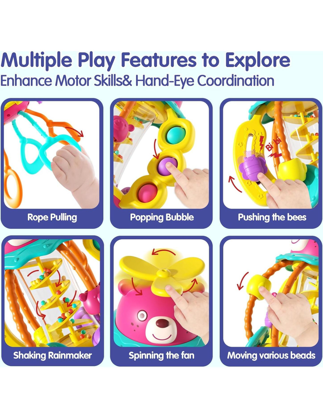 - Juguetes Sensoriales para Bebés Atractivos: Excelentes juguetes para bebés de 0-6 y 6-12 meses, el sonajero para bebés cuenta con abejas presionables, burbujas que estallan, una variedad de formas de cuentas y un generador de gotas de lluvia que produce sonidos suaves. Estos juguetes estimulan las habilidades motoras finas, el desarrollo táctil y los sentidos auditivos, manteniendo a tu pequeño ocupado durante horas.