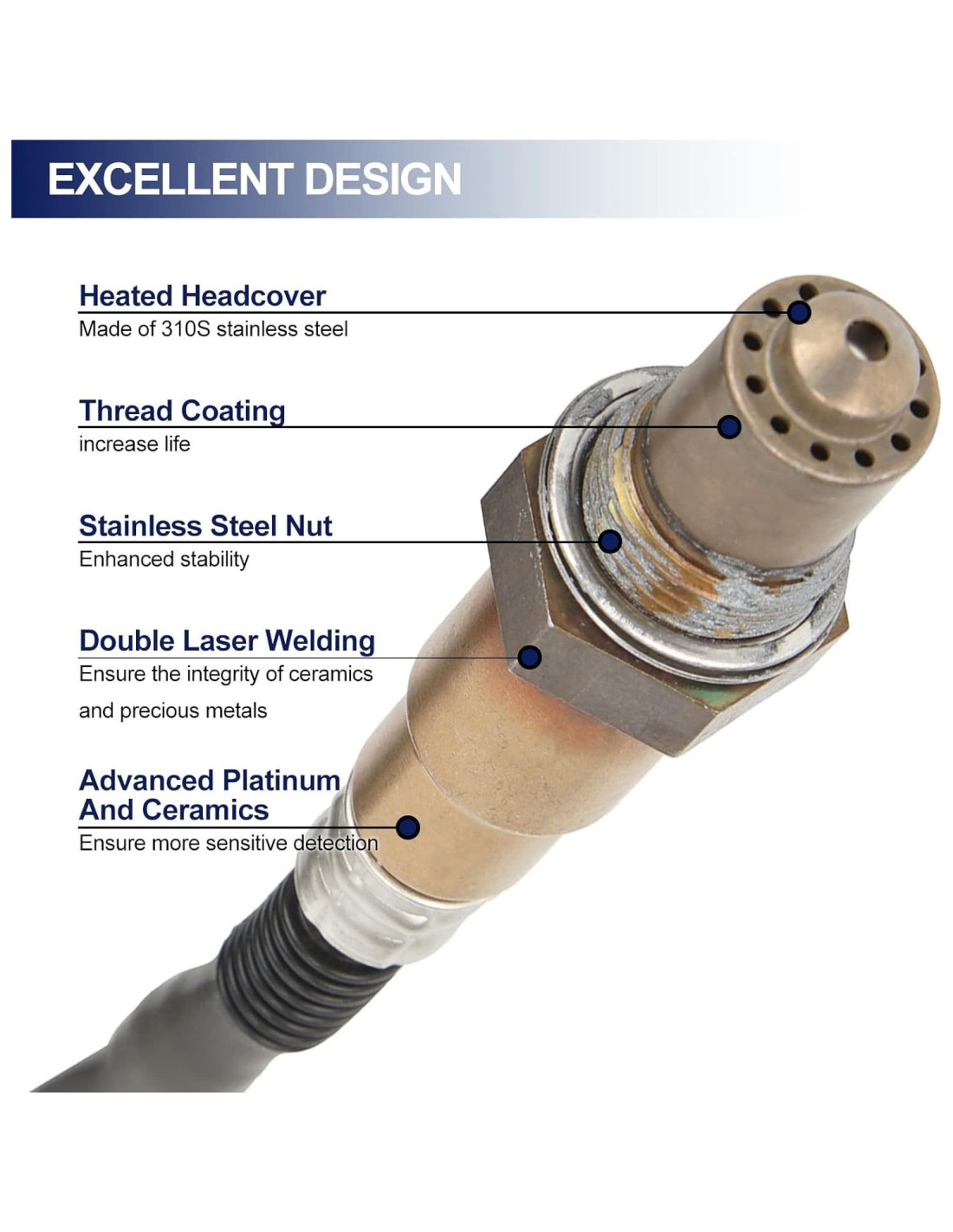 - DISEÑO INTERNO Y EXTERNO - El sensor de oxígeno JOYOMSTW con calefactor incorporado acelera la ignición y mejora la eficiencia del combustible; Cerámica blanca incorporada hasta 650 C; Chip OEM mejora la precisión; La membrana transpirable asegura que el sensor pueda estar aislado