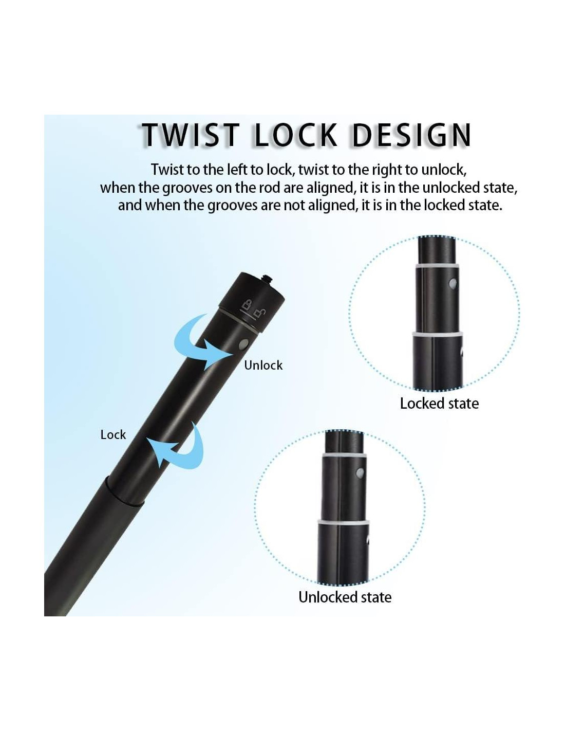 Los agujeros de tornillo de 1/4" se adaptan a la mayoría de los accesorios de cámara, y puedes montar un trípode en la parte inferior. La parte de agarre del palo de selfie es una cubierta antideslizante hecha de material de silicona, que aumenta la fricción y reduce el riesgo de caídas. El palo de selfie está hecho de aleación de aluminio de alta calidad, que no es fácil de deformar o oxidar, y se puede usar durante mucho tiempo. El diseño de bloqueo por torsión es conveniente para la expansión y contracción, y se fija y estabiliza después de apretar. Consiste en cinco secciones, y la longitud se puede ajustar arbitrariamente.