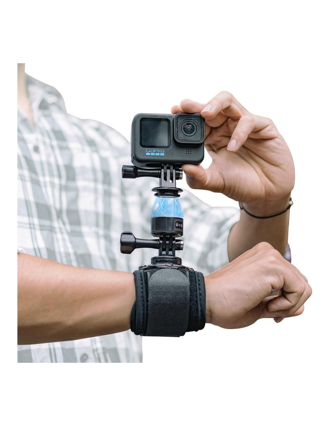 - Rotación de 360: La cabeza esférica rotativa de 360 está fijada en la correa de muñeca, permitiendo que la cámara GoPro realice grabaciones rotativas de 360 en el plano horizontal y ajuste el ángulo 180 hacia adelante y hacia atrás. Te permite realizar grabaciones con los ángulos deseados durante los deportes.