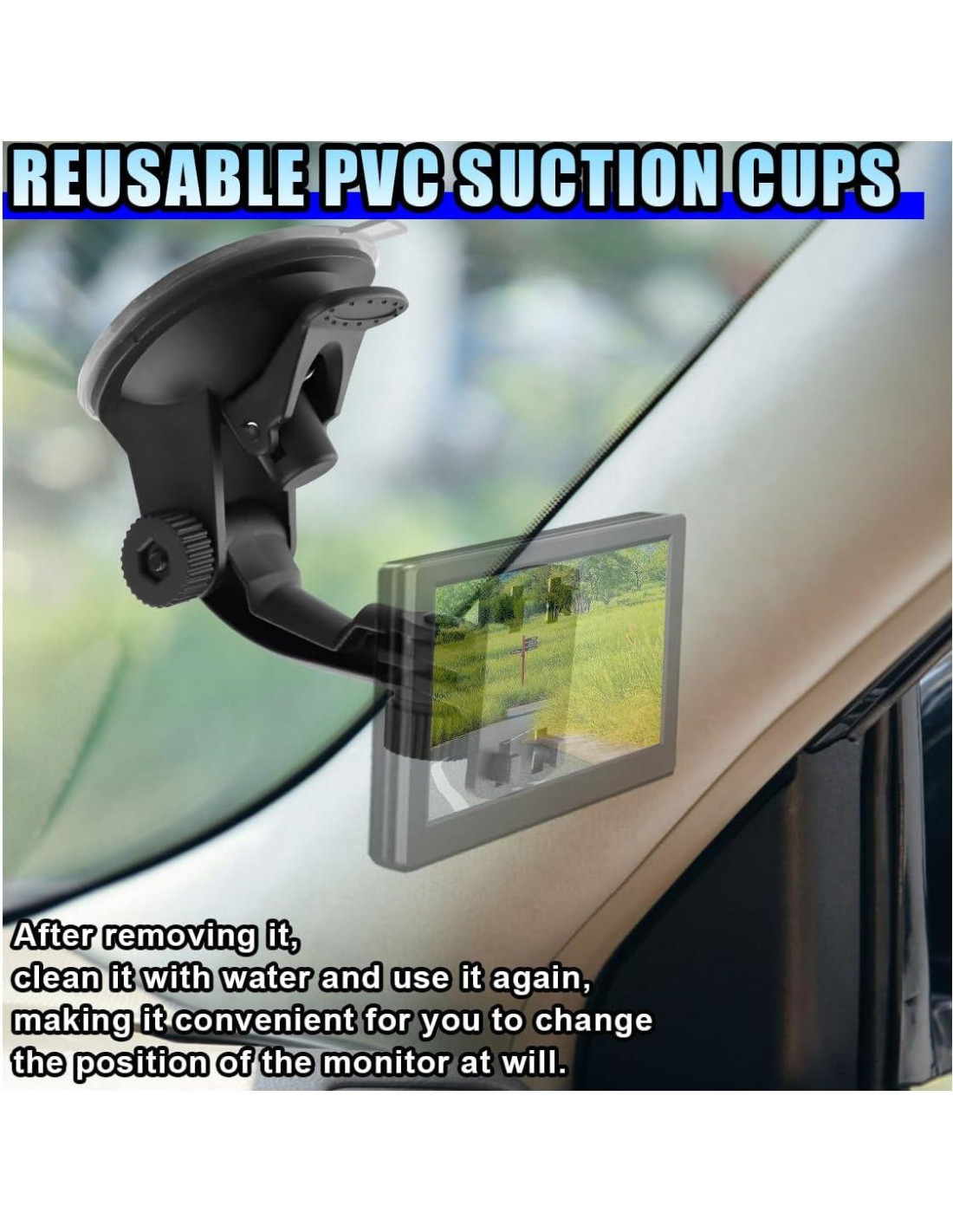 - Soporte de Monitor Poderoso: El soporte de pantalla de cámara de respaldo mide 11.48 cm de alto con una estructura compacta (3.05 x 1.85 cm), no obstruirá su vista. Doble ventosa con un diámetro de 68 mm proporciona un agarre fuerte, manteniendo el monitor estable incluso en carreteras irregulares o durante frenadas repentinas.