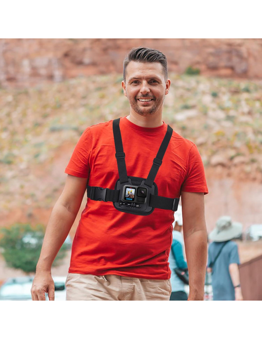 - [Más aplicaciones] Soporte de correa para el pecho para esquiar, caminar, hacer senderismo, pescar, saltar, jugar, andar en bicicleta, montar en motocicleta, bucear, hacer kayak, hacer rafting, surfear, escalar, fútbol, vlog, soporte para teléfono POV y más actividades.