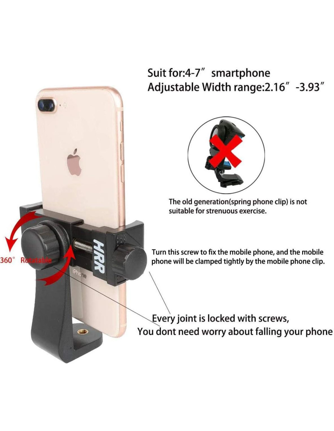 - Estructura estable. Hay dos almohadillas de goma antideslizantes en la parte inferior y superior del soporte para teléfono; cuando usas la llave inglesa mini proporcionada para apretar el tornillo largo al soporte de gancho en J, el clip del teléfono móvil estará de acuerdo con tu ángulo ajustado, disparo estable, no se deslizará.