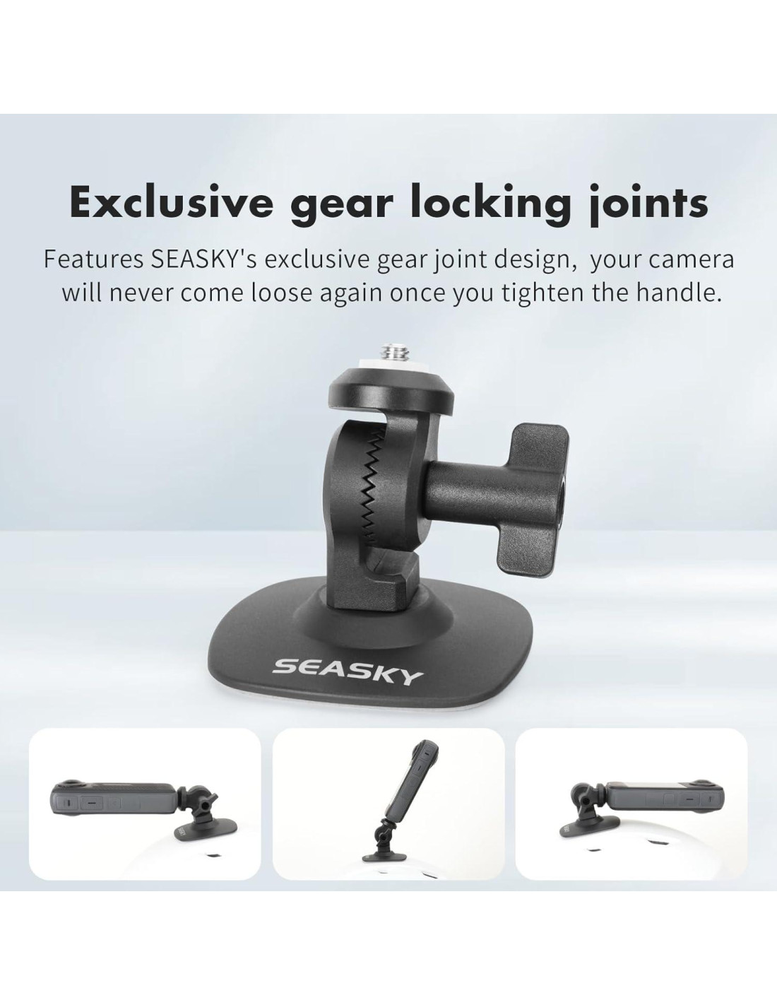 - [ Juntas de bloqueo de engranaje exclusivas ] El montaje de casco SEASKY A2 presenta el diseño de junta de engranaje exclusivo de SEASKY, por lo que tu cámara nunca se soltará una vez que aprietes la manija.
