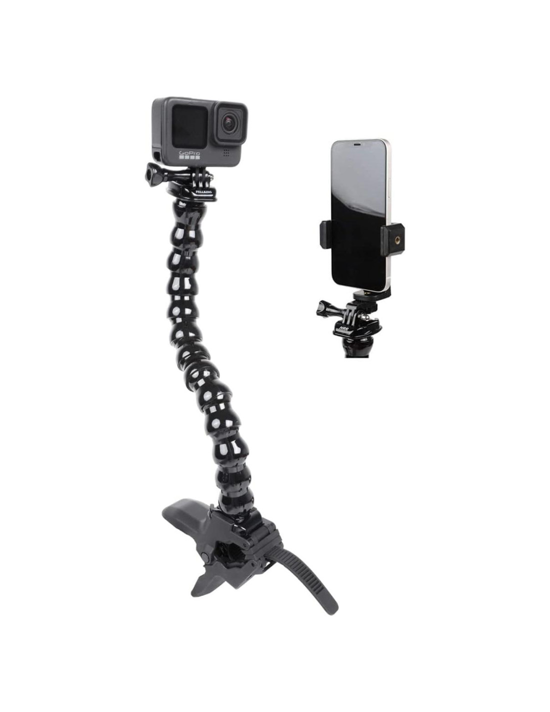 - Extremadamente duradero y fuerte: las Jaws y el brazo flexible pueden usarse juntos o por separado. Las Jaws sujetan tu cámara firmemente en el manillar, escritorio, etc.; el brazo flexible opcional se ajusta para permitir una variedad de ángulos de disparo como un palo de selfie