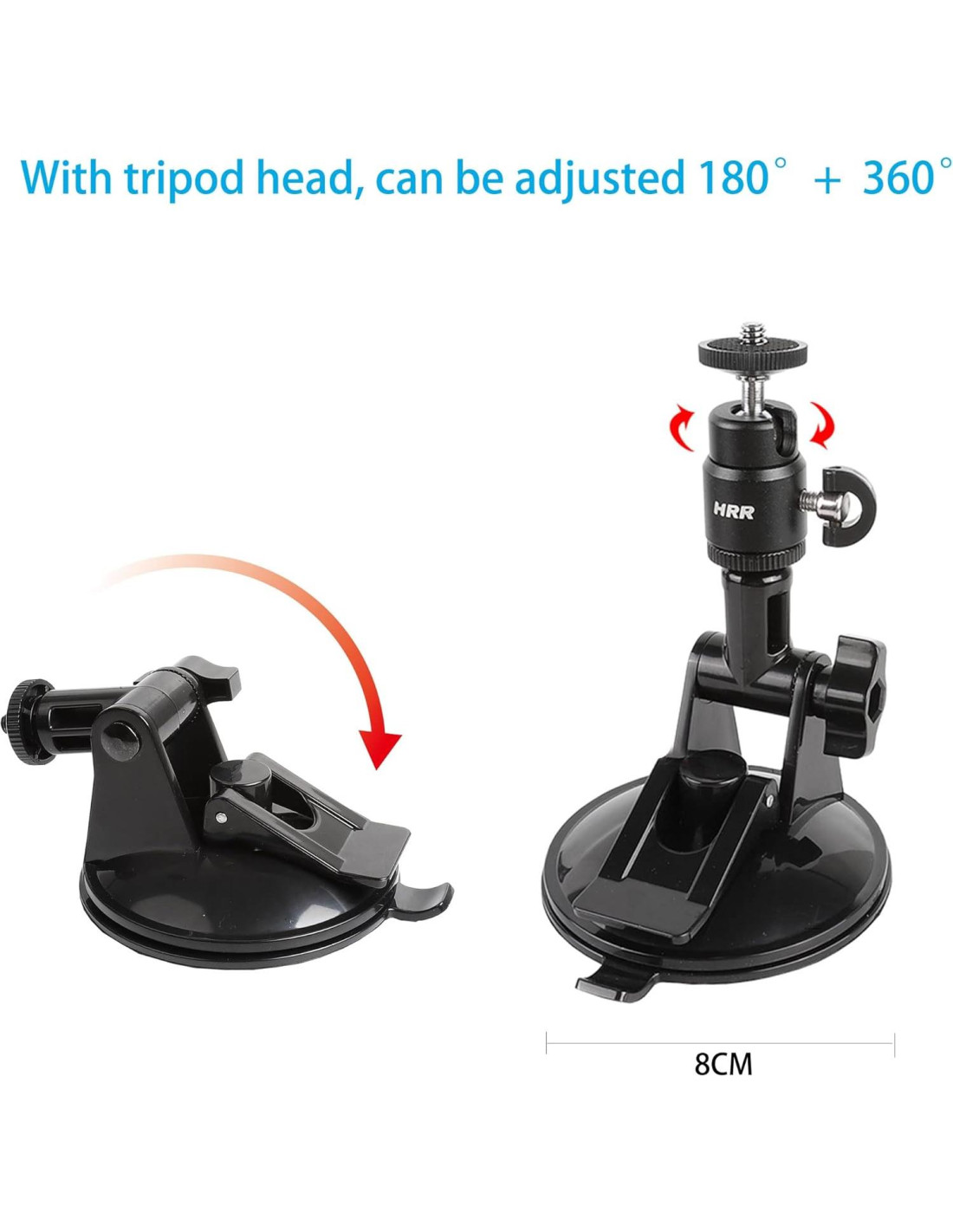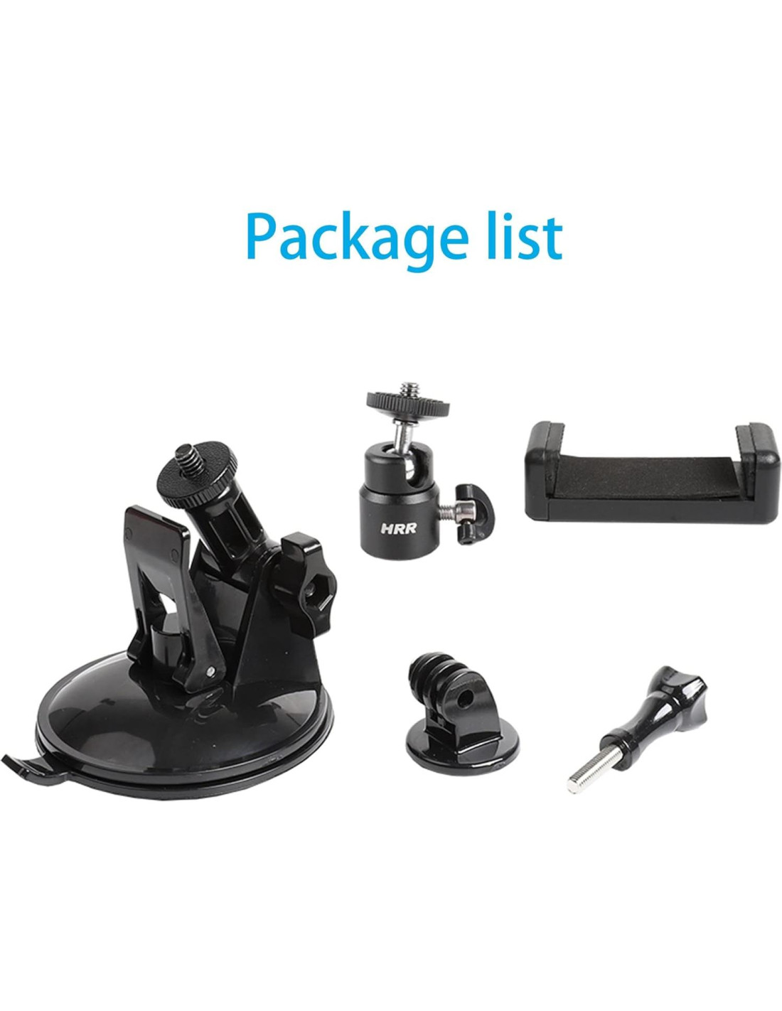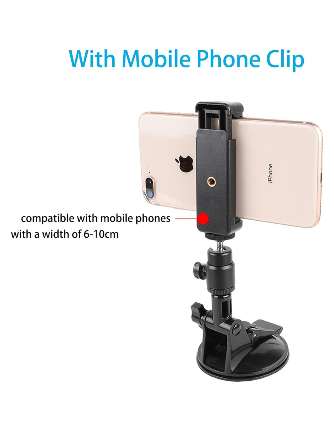 - El paquete incluye: 1 * soporte de ventosa, 1 * cabeza de trípode rotativa de 360, 1 * adaptador de 1/4 de pulgada, 1 * soporte para teléfono, 1 * tornillo de mariposa.