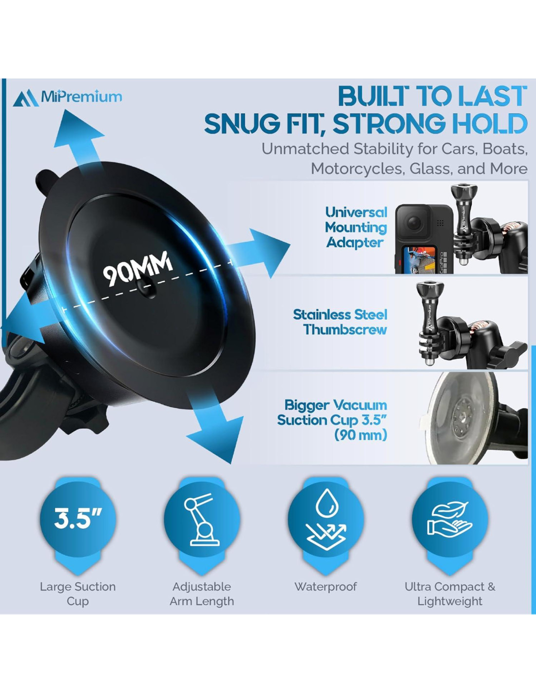 - No rompas otra cámara de acción: Diseñado para mantener tu cámara de forma segura y firme en su lugar durante tus emocionantes paseos. El soporte de cámara de ventosa MiPremium viene con un área de ventosa de 3.5" (90mm) que está hecha de dos capas de TPU para ofrecer una gran capacidad de succión. Coloca nuestro soporte de dashcam en parabrisas, cristales, ventanas, tableros, incluso capó de automóvil y cualquier otra superficie lisa, convirtiéndolo en un soporte de ventosa perfecto para GoPro y otras cámaras de acción.