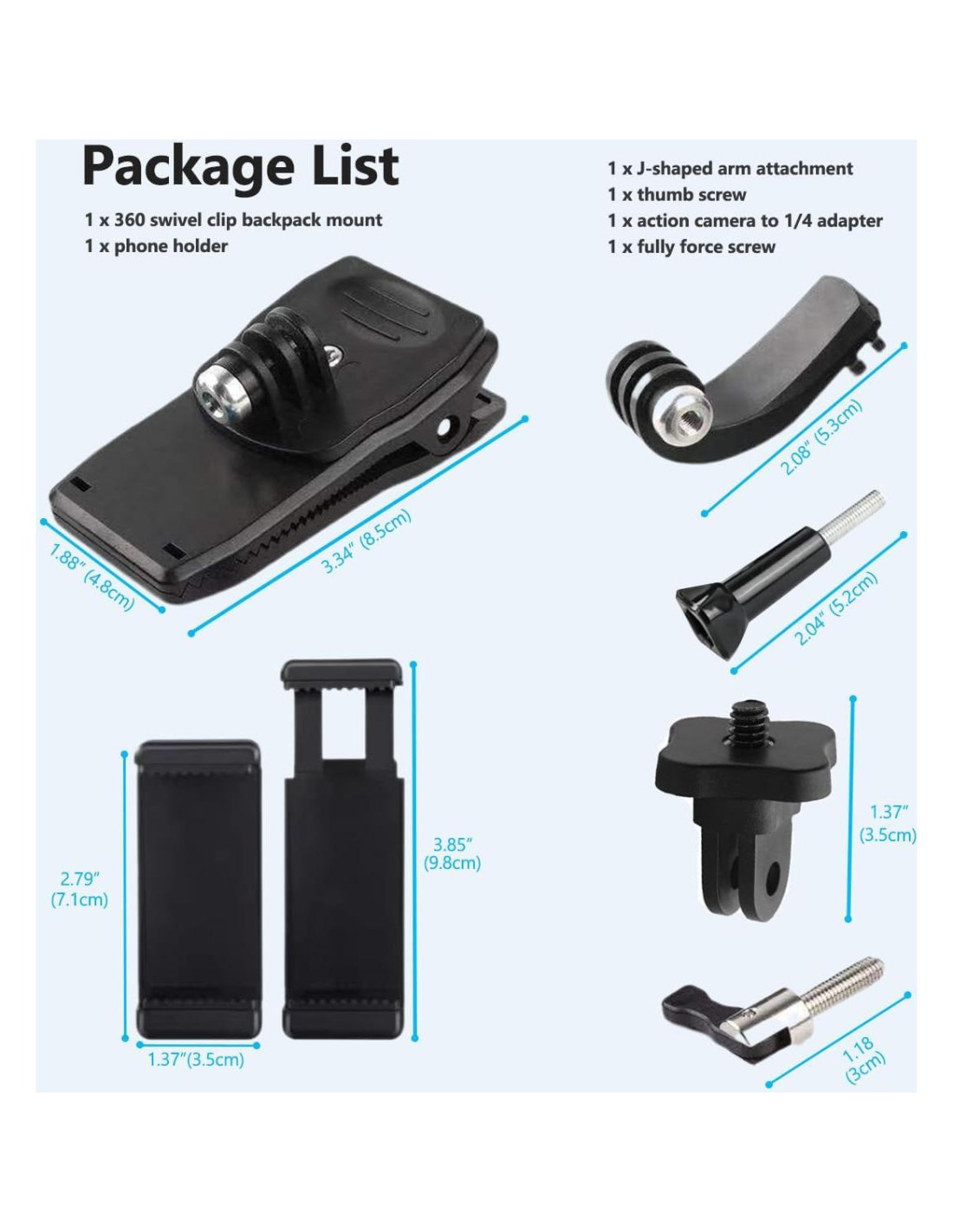 - Qué hay en la caja: 1 x soporte de mochila con clip giratorio 360, 1 x soporte para teléfono, 1 x accesorio de brazo en forma de J, 1 x tornillo de pulgar, 1 x tornillo de fuerza total, 1 x adaptador de cámara de acción a 1/4