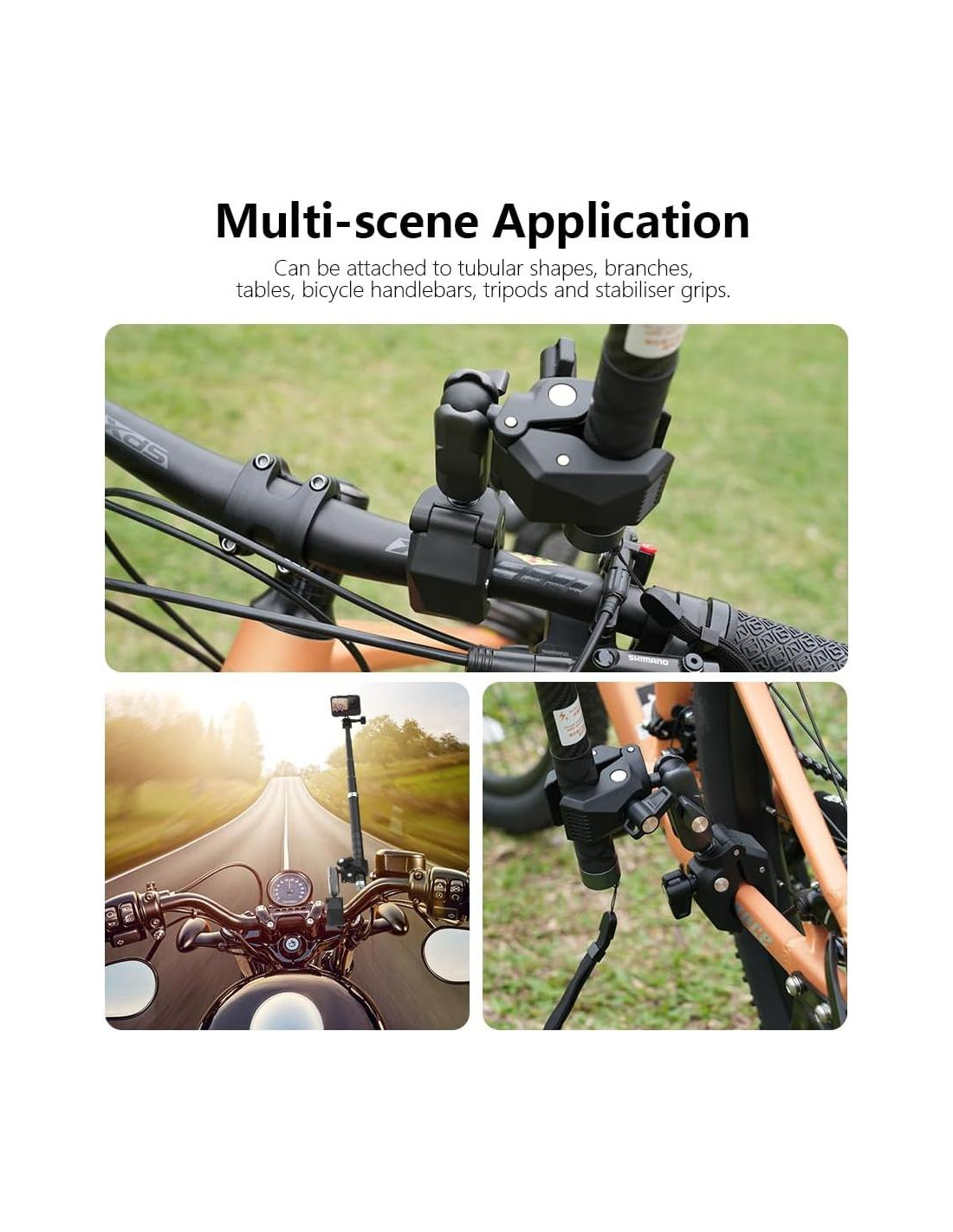 - [Parte del Kit de Aventura] Para ciclismo y más usos, la doble abrazadera es más práctica que un soporte de abrazadera simple, siempre que tengas una varilla de extensión o un palo de selfie, puede realizarse la abrazadera en cualquier lugar dentro del rango de 0.59-1.5 pulgadas/15-38mm. Para abrazadera simple, compra B0DS6L2GR8, para kit de aventura de motocicleta, compra B0FBLF8YPM.